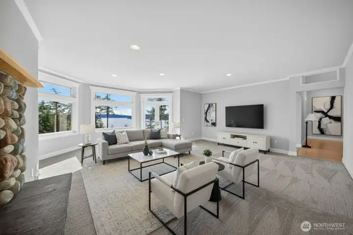 Nestled in a private, gated, tree-lined setting with breathtaking water views, this beautifully maintained home offers a seamless blend of tranquility and modern comfort. The expansive property features lush landscaping and detached outbuildings—including a 30x70 plumbed shop with two levels of workspace, ideal for an in-law setup, workshop, or additional living space. Inside, a bright open-concept design is filled with natural light and showcases stunning water views from nearly every angle. The updated kitchen offers sleek cabinetry, ample counter space, and a large island perfect for entertaining. Oversized windows frame the scenery, creating a strong connection to the outdoors, while an in-home elevator adds convenience and accessibility. Step onto the covered deck and unwind in the hot tub while enjoying peaceful, elevated shoreline views. The spacious yard offers room to garden, play, or relax in your own private retreat. Additional highlights include a beautifully appointed primary bath, multiple view-oriented living areas, and a covered outdoor entertaining space for year-round use. The lower level provides flexible space for hobbies, storage, or a home gym, with expansive garage areas for vehicles, tools, and recreational gear. With its distinctive architecture, serene setting, and close proximity to the water, this home is a rare opportunity to experience Pacific Northwest living at its finest. Some photos have been generated by AI.