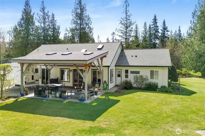 Private 4+ acre retreat offering space, versatility, and room to truly enjoy the outdoors. This beautifully maintained 4-bedroom rambler is designed for entertaining, featuring an inviting layout that flows seamlessly to a spacious covered back deck—perfect for year-round gatherings. Thoughtfully designed, the primary suite is privately situated at one end of the home, creating a peaceful retreat, while the additional bedrooms are located on the opposite side for ideal separation and functionality. The expansive, flat property is fully landscaped and meticulously cared for, creating a serene and highly usable setting. A standout feature is the impressive 2,100 sq’ fully equipped shop with ample space for an RV, large boat, and all your toys—ideal for hobbyists, storage, or workspace needs. The 800 sq’ two-level casita offers incredible flexibility for guests, multi-generational living, or potential rental income. Enjoy endless outdoor fun with a charming playhouse, zipline, and private trails winding through the property. Tucked away in a quiet setting, yet just 10 minutes to central Bellingham and located in the desirable Meridian School District, this property delivers the perfect blend of privacy, functionality, and lifestyle.