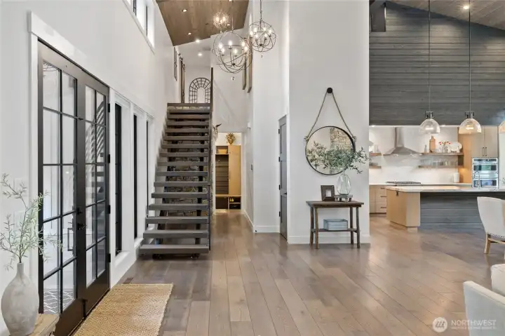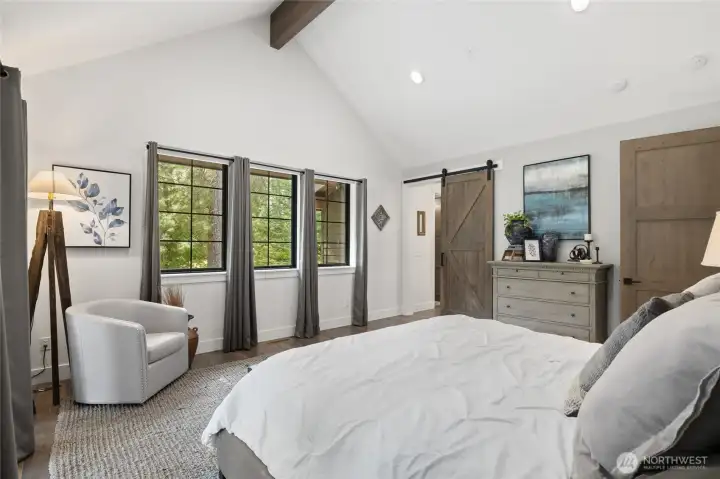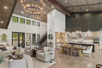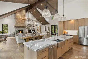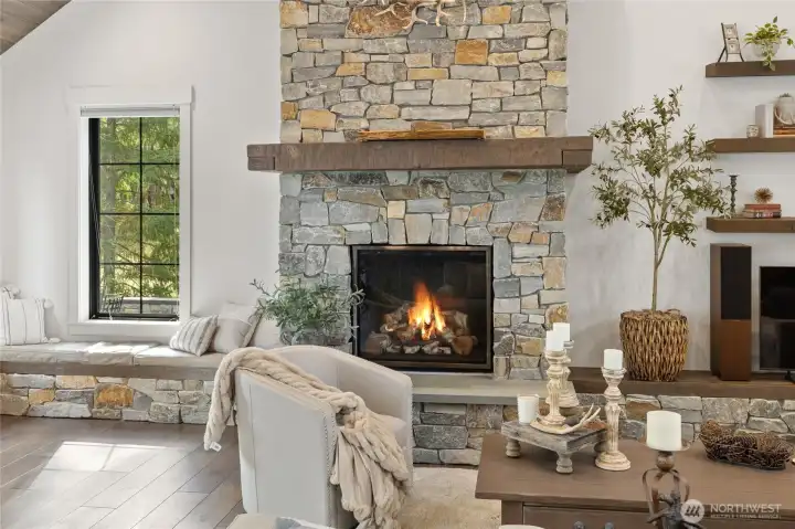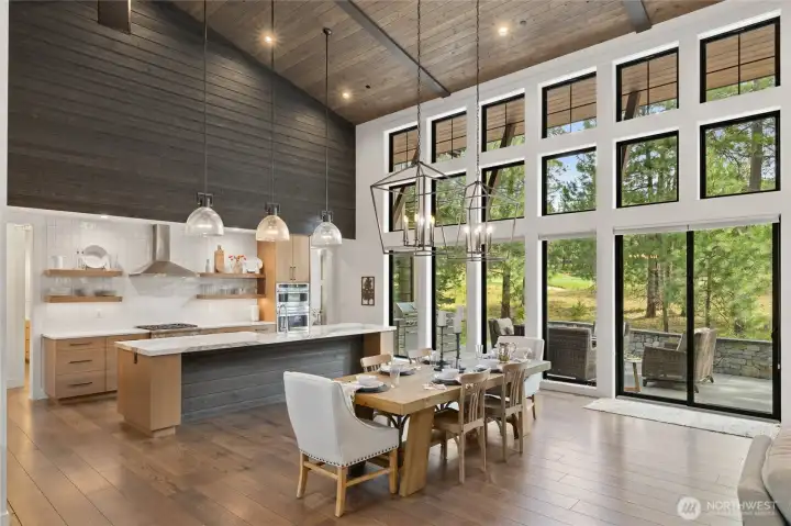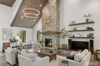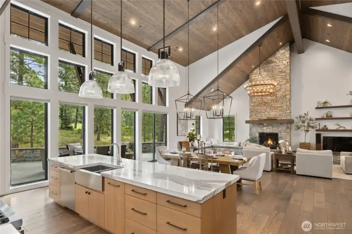Spectacular mountain masterpiece at Suncadia Resort, overlooking the 8th green of the Prospector Golf Course on a quiet cul-de-sac. Designed to capture panoramic views and natural light, this exceptional home fuses modern luxury with warm mountain character. The soaring great room features a floor-to-ceiling stone fireplace (20ft), dramatic tongue-and-groove cedar ceilings with exposed steel beams, built-in bench seating, and designer lighting, creating a striking centerpiece for entertaining and everyday living. The kitchen cabinets are rift sawn white oak and features a massive quartz island, and matching quartz countertops, perfect for entertaining in style. The main-level primary suite offers a serene retreat with a slider to the covered patio. Two additional well-appointed bedrooms complete the main level. Upstairs includes two ensuite bedrooms, and a generous TV/bonus room with an elevated deck overlooking the green. Outdoor living features a covered front porch, expansive back patio, and cozy fire pit, offering multiple spaces to relax and enjoy the surroundings. A rare opportunity to enjoy year-round mountain living at Suncadia Resort.