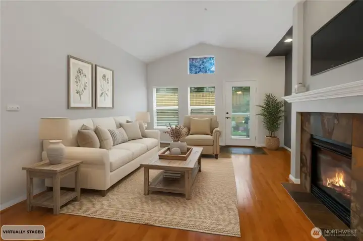 Welcome Home to this 3-bedroom, 2.5-bathroom condominium in the sought after gated community of Madera in Lakeland Hills. This end unit condo has tons of privacy. The main floor has a large, well-lit living space with a cozy gas fireplace and hardwood floors with a door that opens to the back patio with plenty of room for outdoor entertaining and a raised garden area. The kitchen has stainless steel appliances, granite counters and a cozy eating nook with windows on all sides. Main level primary suite with 5-piece bathroom and large walk-in closet. Upstairs is a great flex space with many possibilities! 2 additional bedrooms with an additional full bath. 2 car attached garage with storage area. Close to shops, restaurants and walking trails. Just minutes from Lake Tapps. HOA dues cover exterior maintenance, roof, siding, lawn care, water and sewer.
