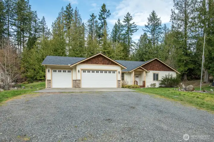 This spacious well laid-out rambler sits on 1.25 beautiful acres with easy access to I-5, shopping, and dining. Great room concept with large kitchen withpantry, bar space, and large eating area. It's also open to the large living/family room with gas fireplace. Large dining room as well that could also be another living room or family room. The primary suite is on one end of the house and has a very spacious bedroom, large 5 piece bath with jetted soaking tub and walk-in shower, large walk-in closet, and separate toilet space. 2 bedrooms and a full bathroom are at the opposite end on the house. Another large bedroom with french doors sits at the front of the house and could also be added living space. Large 3 car garage. Property also includes a detached 18x20 foot shop and RV electrical and water hook-up.