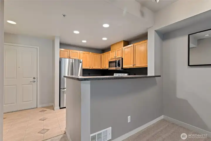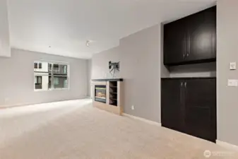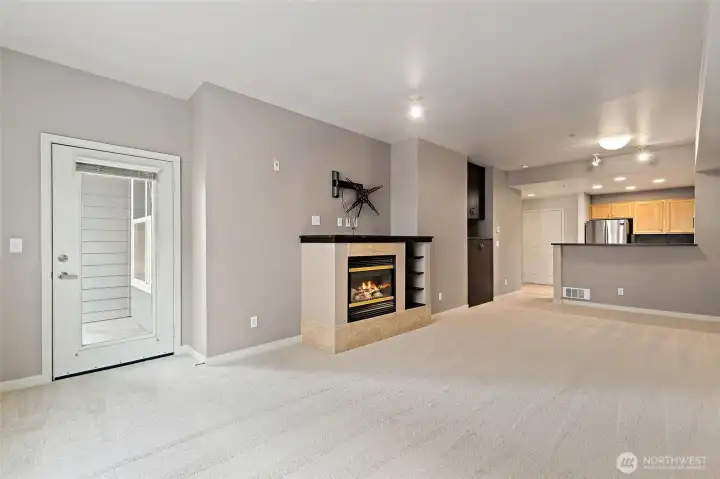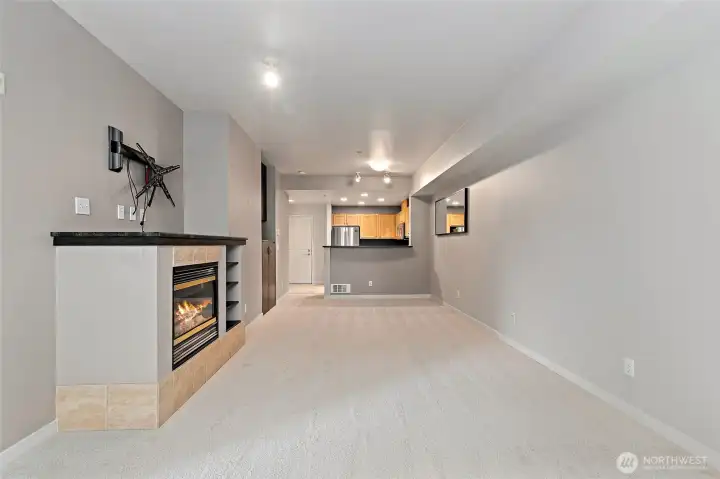 Wide open contemporary condo in the heart of downtown Redmond! Just minutes from Redmond Town Center, Bella Bottega, the Sammamish River Trail, bus, and new transit center, this home offers the perfect blend of convenience and comfort. The secure building features a controlled entrance, elevator access, and assigned parking in a secure garage, along with additional visitor parking. Inside, enjoy a bright great room with a cozy fireplace. The large bedroom and bath provide comfortable living, while the balcony offers a relaxing outdoor retreat. Recent updates include fresh paint, brand-new carpet, and new blinds for a clean, modern feel. The kitchen comes fully equipped with all appliances, including a brand-new high-end Bosch microwave. A recent remodel also added a convenient storage closet for extra space. Items that stay with the home include a large mirror and TV mount. Community amenities include a shared BBQ and patio area—perfect for entertaining. Move-in ready and ideally located near shopping, dining, trails, and major employers!