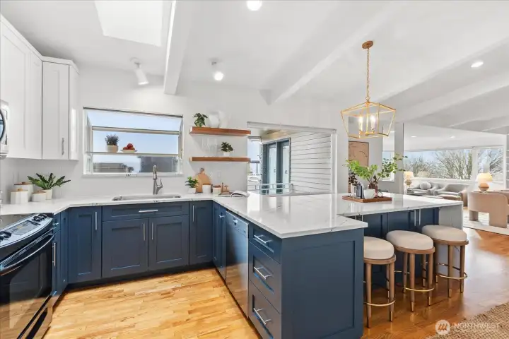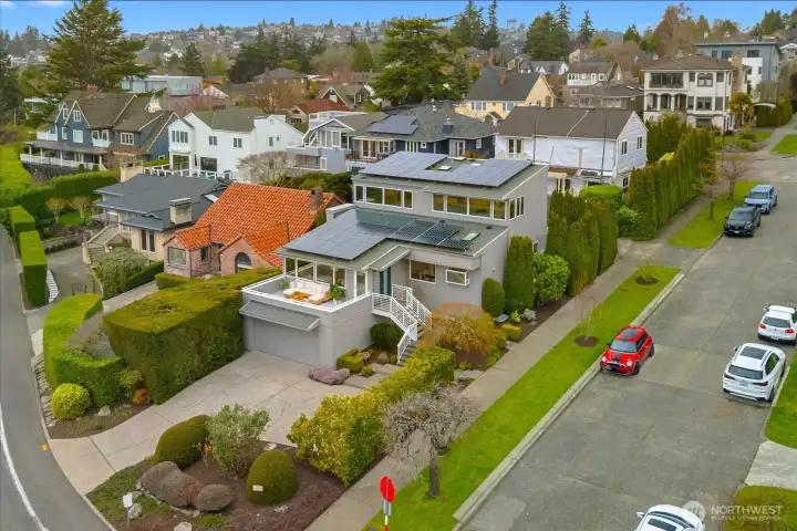 Luxury, efficiency, and location in one rare offering! Stunning elevator served home with commanding views and near zero electric bills thanks to solar and battery power. Experience refined living in this beautifully renovated residence, where exceptional craftsmanship and thoughtful design enhance every level. A private elevator connects all three floors for effortless access. This all electric home includes rooftop solar and a garage wall mounted battery system that dramatically reduces utility bills and provides quiet, seamless backup power without the need for a generator. The main level features an inviting great room with multiple seating areas, a striking fireplace, vaulted ceilings, a dining room with charming custom built ins, and a bright kitchen with generous storage, large island, and second fridge/freezer. Upstairs, the light filled primary suite and adjoining office capture sweeping water and mountain views, creating an inspiring workspace and serene retreat. The spa like bath includes skylights and a standalone soaking tub. The lower level adds a versatile rec room with wet bar, two bedrooms, and a stylish three quarter bath—ideal for guests or casual gatherings. Outside, enjoy a sunset ready front deck, private courtyard framed by manicured hedges, a two car garage, and ample off street parking. Minutes to downtown and the Village, this home blends luxury, livability, and premier location.