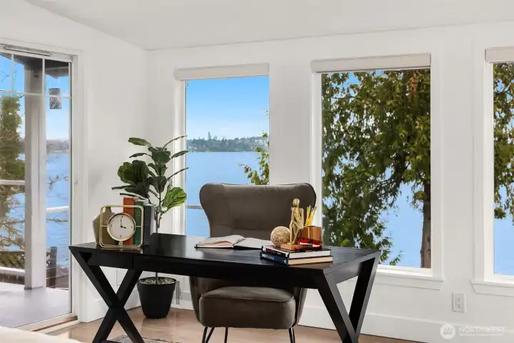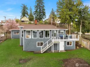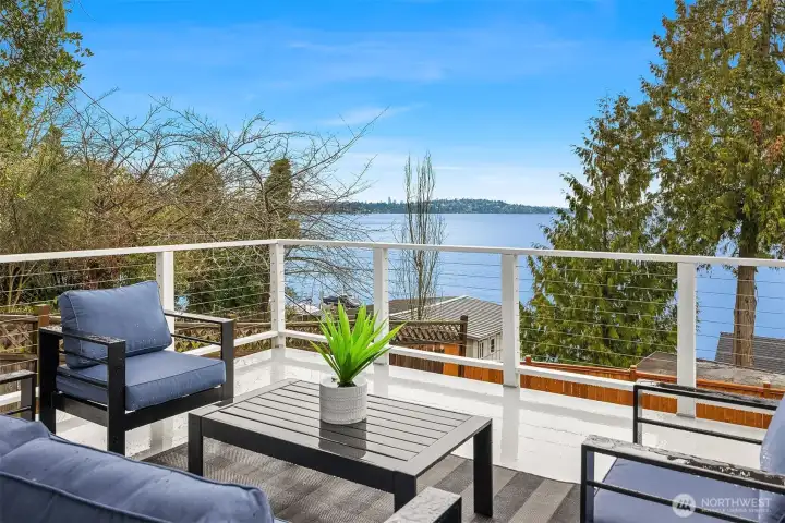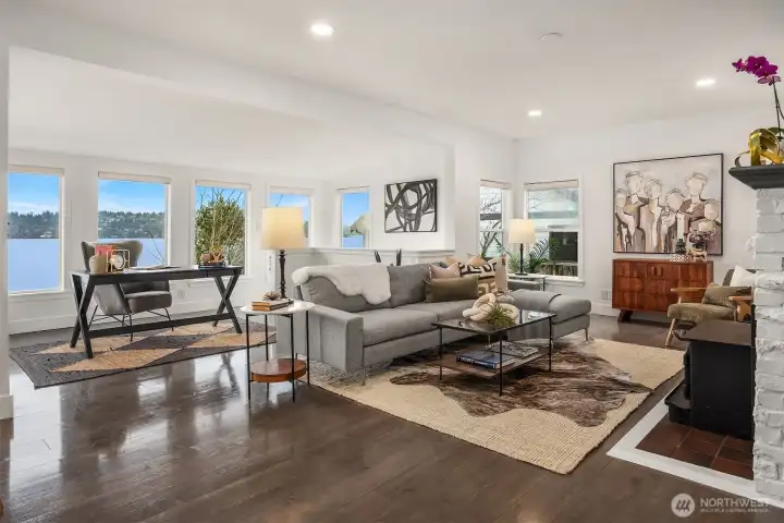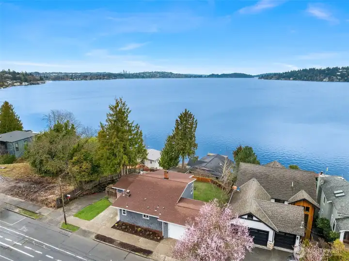 Welcome home. Remodeled 1908 Lake Washington classic boasting architecturally designed updated floor plan. Sprawling open spaces showcased by a lakeside wall of glass, taking advantage of sweeping lake, island & mountain views. Large gourmet kitchen with adjacent dining room. The formal living room boasts an original fireplace. Main-floor primary bedroom with bath. 2nd main bedroom at the opposite end of the house has a continental-view deck. Additional main floor full bath.Level entry daylight lower level has 3rd bedroom with private bath & direct access to private fenced back yard, with gate down to water. Private stairs lead to your own 10’ of Lake Washington waterfront. Install a custom private recreational dock!