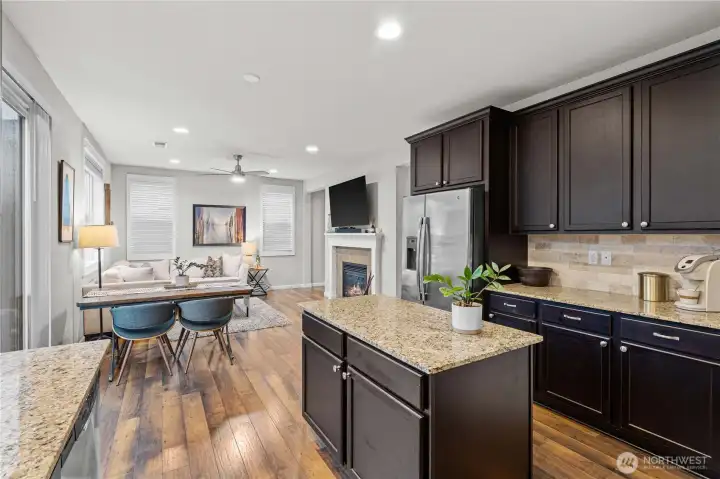 Welcome to Lakeland Hills living in this beautifully maintained one-owner home built in 2015. Thoughtfully designed with 3 bedrooms, 2.5 baths and 1910 sq ft, this beautiful home features an open-concept layout, spacious kitchen with granite island, and a unique built-in bar and serving station perfect for entertaining. The main level is ideal for everyday living and entertaining, featuring warm flooring, a cozy gas fireplace, and a spacious kitchen with granite countertops, island with seating, GE gas range, stainless appliances, and soft-close cabinetry. Upstairs you'll find a versatile second living room/loft, ideal for a media room, office, or play space. The spacious primary suite offers a relaxing retreat with double vanity, soaking tub, separate shower, while two additional bedrooms provide flexibility for guests or work-from-home needs. Enjoy outdoor living in the fully fenced and landscaped backyard with mature Japanese maple and birch trees and a patio space with retractable awning, perfect for relaxing or hosting friends. Additional features not to miss: high-end 2" wood slat blinds, smart lighting controls, and a whisper-quiet LiftMaster belt-drive garage opener with battery backup and auto close! Driveway Ring camera stays too! All located in the sought-after Lakeland Hills community near parks, trails, schools, shopping, and dining, this is one not to miss!