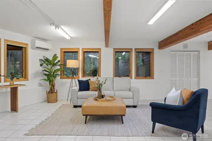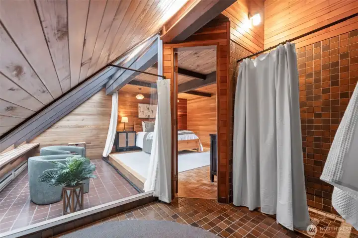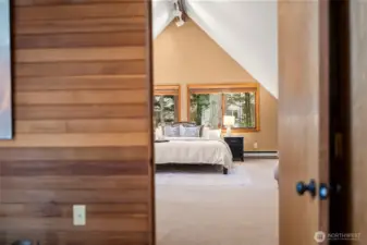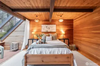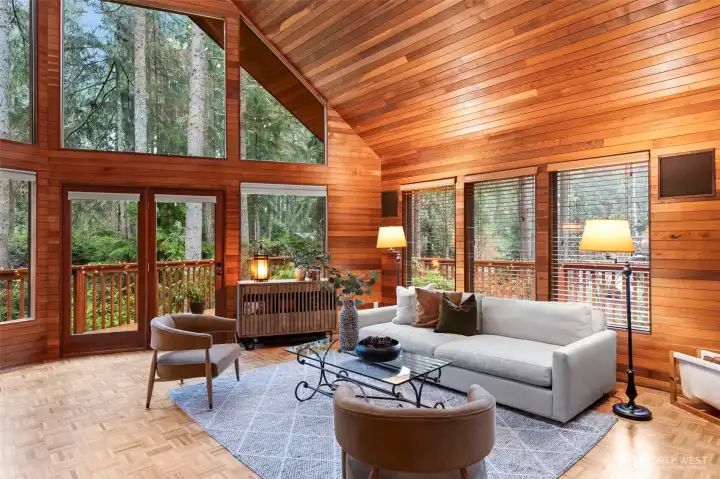 Experience a rare synthesis of a Tahoe-inspired mountain retreat and the vibrant lifestyle of downtown Gig Harbor. This architectural haven is a refreshing departure from the ordinary, offering a sought-after "in-town" trifecta: a walkable location just blocks from the harbor, soaring volumes, and the effortless, low-maintenance appeal of a secluded wooded lot. The interior is defined by organic warmth, where vaulted wood-clad ceilings and expansive windows capture the dappled light streaming through the trees. The design offers exceptional versatility; the main floor features an inviting primary-style bedroom and bath, while the upper level serves as a true primary escape. This expansive top floor—a sophisticated aerie—includes a full bath, a dedicated office, and a lofted lounge with a bird’s-eye view over the great room. The functionality continues with a fully finished lower level featuring a separate entry—an ideal space for a creative studio or professional workspace. Meticulously staged to highlight the home’s rich wood tones and luminous interior, "The Chalet" invites a lifestyle of cozy, refined quiet. Whether you are enjoying the views from the wrap-around deck or strolling to a local gallery, this is a home for those who value character, privacy, and an unmistakable sense of place.