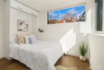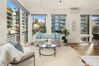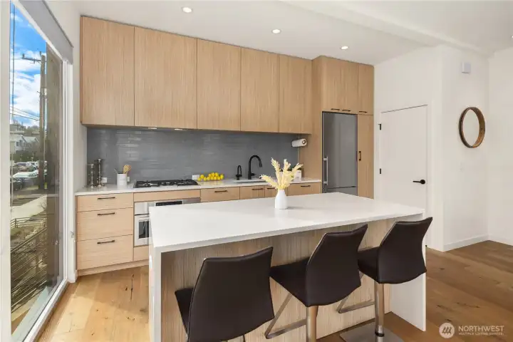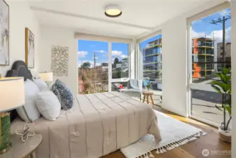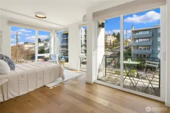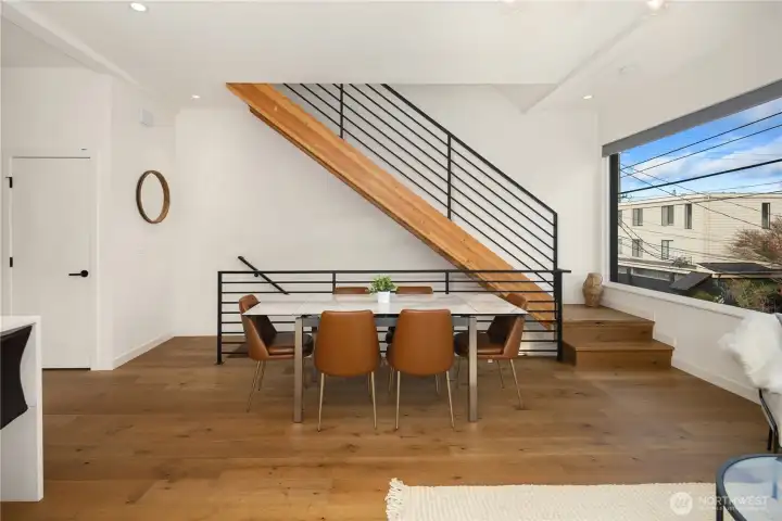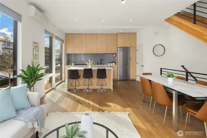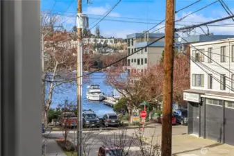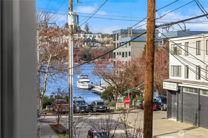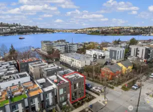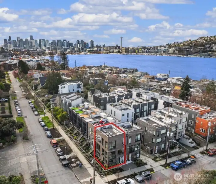 Bright & spacious corner living just one block from Lake Union and neighborhood gem Pete’s Market & Wine! Floor-to-ceiling windows flood this home with natural light, paired with clever top-down/bottom-up shades so you can decide exactly how much of the world you want to see. Enjoy panoramic views of the Space Needle, Lake Union, the Cascade Mountains, & surrounding neighborhoods from the expansive rooftop deck, thoughtfully equipped with gas & water hookups for easy entertaining. The generous kitchen is appointed with quartz countertops, gas cooking stove, high-end appliances, & instant hot water for effortless convenience. Beautiful engineered hardwoods run throughout, while a Juliet balcony brings in fresh air & peekaboo Lake Union views. A/C keeps things cool during those rare-but-glorious Seattle heat waves. The primary suite offers an east-facing balcony perfect for sunrise coffee or tea, plus a private ensuite. A built-in Murphy bed adds flexibility for a guest room or office space. Thoughtfully upgraded, all bedrooms enjoy custom storage from California Closets. Generous storage continues on the lower level, with expansive luxury closets & cabinetry as well as a laundry folding station. Back door entry for easy home access from the designated, off-street parking space. Excellent access to I-5 & downtown make city living easy, while nearby favorites like Serafina, Mioposto, & Eastlake Coffee & Cafe are just blocks away. It doesn't get better than this!