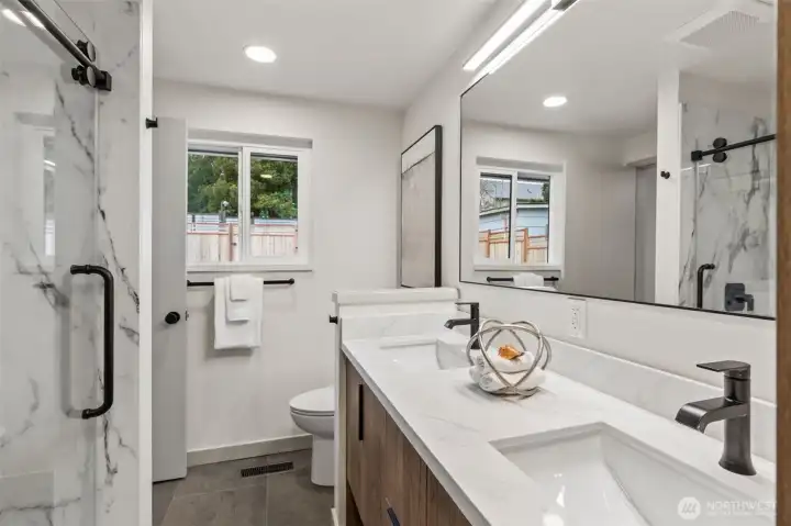 Welcome to a beautifully redesigned home that has been completely rehabbed from top to bottom. Every detail has been thoughtfully updated to deliver modern comfort, style, and peace of mind. Step inside to discover quartz countertops, sleek modern fixtures, and brand-new luxury vinyl plank flooring throughout the fully refreshed interior. The open, bright living space features a tile surround fireplace with custom mantel—perfect for relaxing evenings at home. Superb primary suite with convenient dual access from the bedroom or the hallway. Attention to detail includes the added 3/4 bathroom plus laundry off of the garage. Behind the walls, the upgrades continue with all-new waste lines, a new water supply system, and a brand-new sewer line to the street, giving you long-term reliability. Comfort is covered year-round with a new HVAC system featuring a Bosch air handler and heat pump with A/C. Major exterior improvements include a new roof, new gutters, new windows, and a new garage door, creating both curb appeal and energy efficiency. Step outside to enjoy a fully fenced yard with convenient alley access—ideal for pets, entertaining, or future possibilities. The lawn has been freshly seeded and is ready to flourish. Located just minutes from West Seattle, Westwood Village, local restaurants, coffee, craft beer breweries, transit, bus lines, and easy routes to Seattle, Tacoma, and the airport, this home offers the perfect blend of accessibility and neighborhood comfort.
