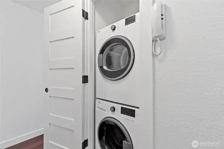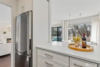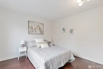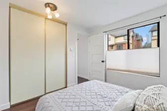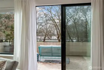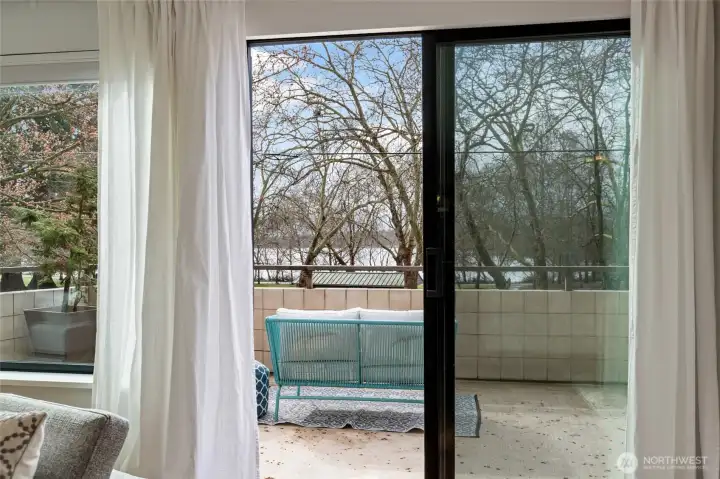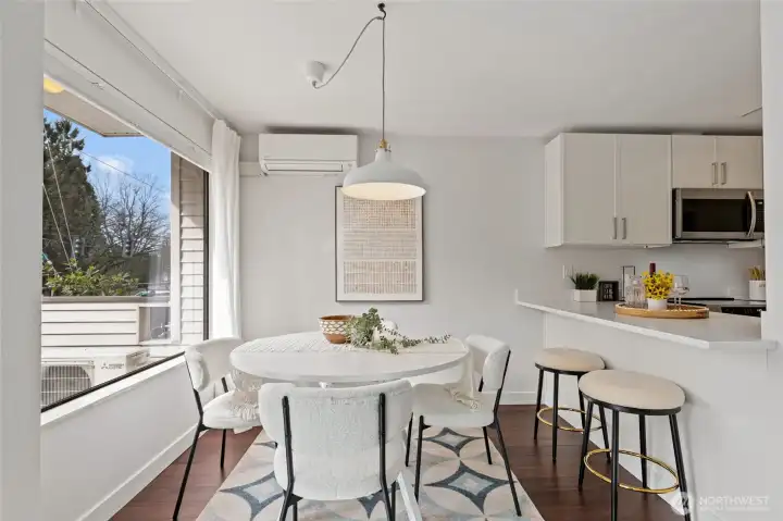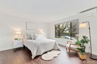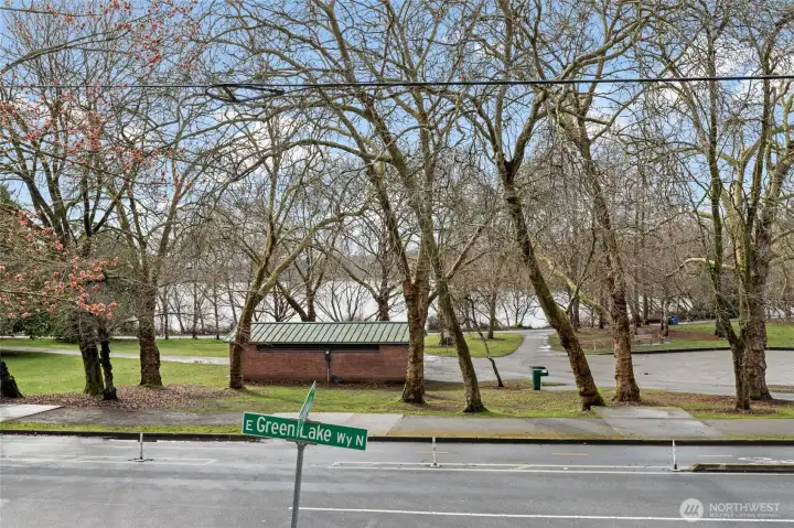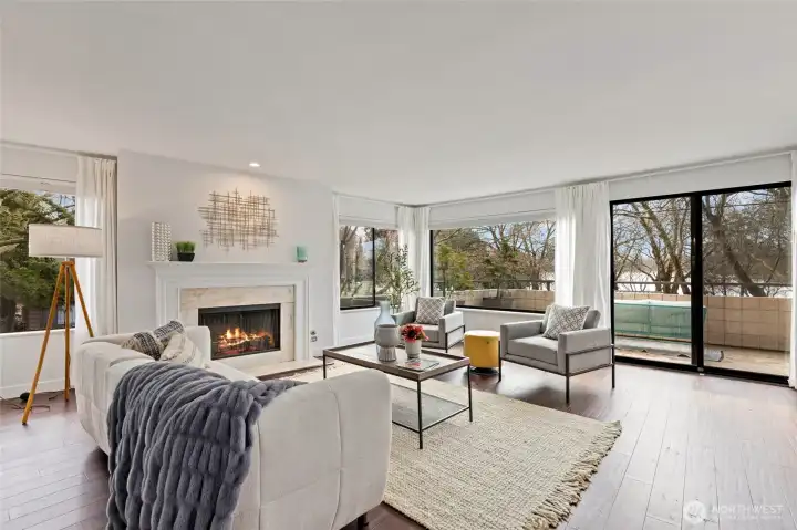The ultimate Lakeside Sanctuary! Directly across from Green Lake, this corner unit features thoughtful modern updates and hardwood floors throughout. The spacious living room offers a sleek gas fireplace, new mini-split A/C, and a wall of windows overlooking the park. Slide open the door to a giant private patio that effectively doubles your living space. Enjoy a smart, spacious layout with generous room sizes, an updated kitchen with quartz counters, and a large primary suite + second bedroom. In-unit W/D! No stairs! Level access from your deeded parking space. Boutique building with elevator, low HOAs and an additional storage locker. ESA-friendly and mere steps to lake trails, cafes, and light rail. Comfort and style in a premier park-front location!