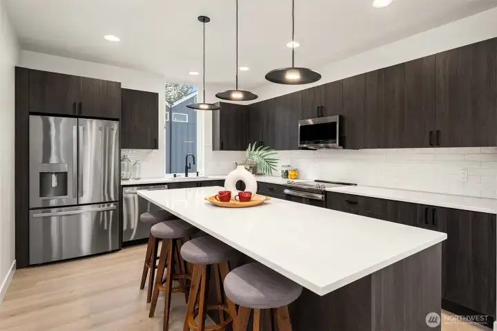 From Ashworth Homes, comes the final home in this delightful enclave in Northeast Seattle. Ultimate hosting or work from home set up with lower level family room with sliders to yard, plus office or bedroom and full bath. Second level features ample dining area, kitchen with premium appliances & spacious island, plus open living room with custom built-ins. Connected to both living and dining areas is an expansive heated and covered deck for all-season outdoor enjoyment. Upstairs, find your primary suite plus additional bedrooms, bath & laundry. Completed by EV-ready two-car garage. Near to the Burke-Gilman Trail and quick access to 522 and I-5 for a simple commute.