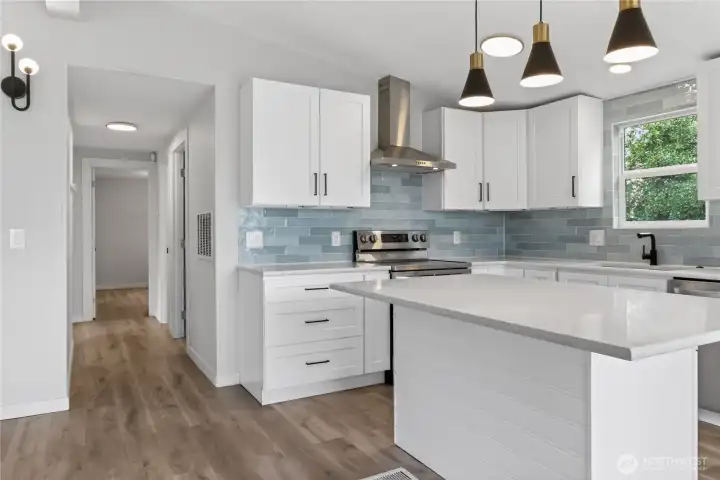 Kitchen with Blue Tile Backsplash, Stainless Range, Quartz Island, and Hallway to Bedrooms
