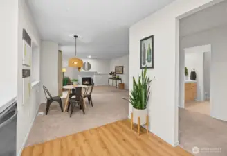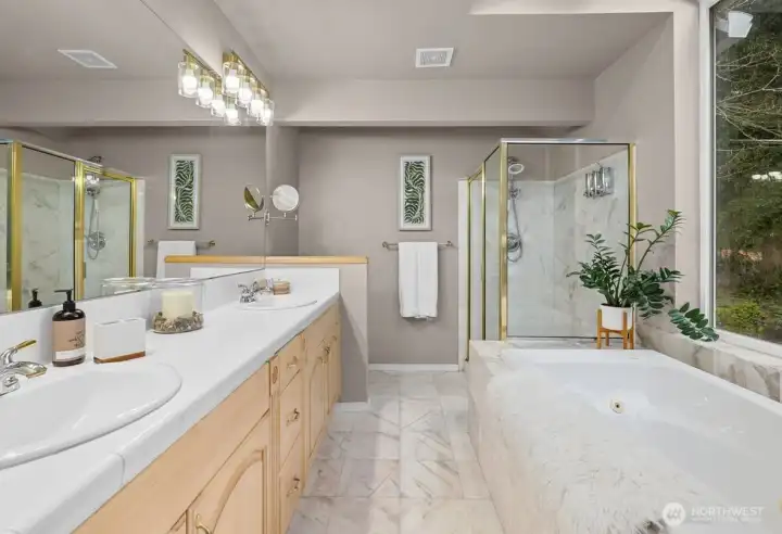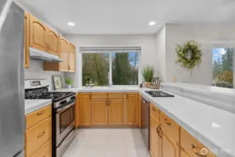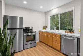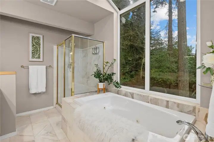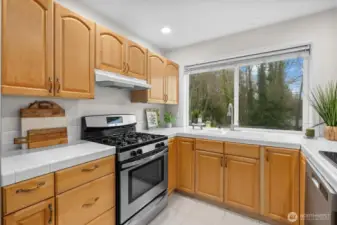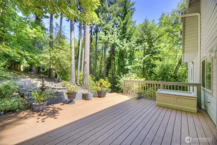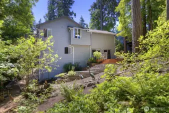 Welcome to this spacious 4 bedroom 3 bath home with 2700 sq ft of living space on a spacious 1/4 acre lot in a peaceful, park-like setting. Surrounded by scenic Northwest nature, trees, and beauty this home offers exceptional privacy and tranquility. Eastside of house backs up to greenbelt with two decks. Main level living has vaulted ceilings and gas fireplace for creating warmth and ambiance throughout the home. Spacious windows on the main living brings in abundant natural light. Kitchen opens up to a great room and eating area with bar seating. SS appliances, tiled countertops and gas stove complete the kitchen. Primary suite is a serene retreat. Enjoy sitting on deck with morning coffee and a 5-piece Spa-inspired marble bathroom with skylight. The lower level is ideal for multigenerational living or guests. Features a secondary kitchen with a new SS Fridge and new laminate hardwood flooring. Could be a potential ADU or rental. Downstairs includes 3 bd, 1 full bath. Expansive family room with gas fireplace. Outdoor living includes terraced areas, water fountain, and entertaining spaces. Located in highly regarded Edmonds School District, mins to Parks, Mountlake Terrace Rail Station, and Alderwood Mall. A rare opportunity to enjoy comfort, privacy, and lifestyle in a beautiful setting.