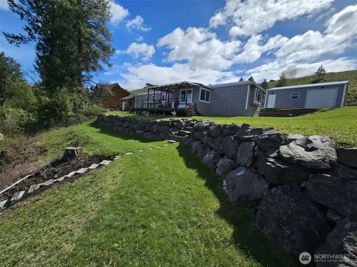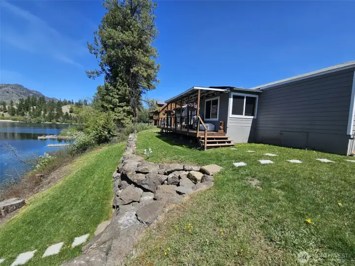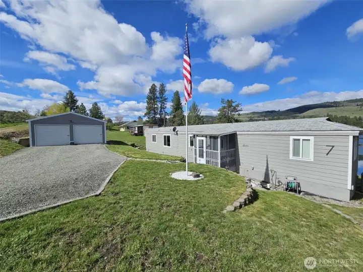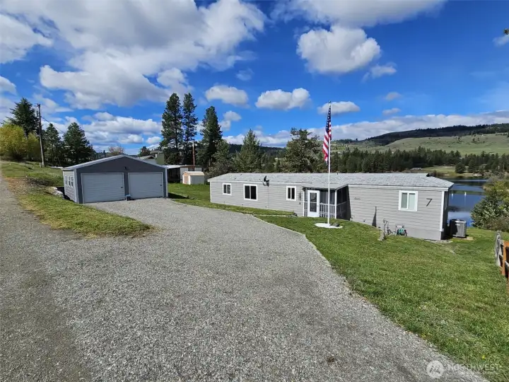 Lake front home in Julian Bay on Curlew Lake. Beautiful views with home sitting only 50 ft off lake. Private floating dock along 100 feet of lake front. Two bedroom, 2 bath manufactured home with 3 bedroom septic. system. All new stainless-steel appliances, new counters, granite island, new windows, siding, flooring and more. New electrical panel, furnace & heat pump. New two car detached garage with 3 roll up doors, walk through door, including 4 windows & cement floor. Plenty of off-street parking as well. Beautiful rockery on lake side with block landscaping throughout yard. Great opportunity to have fantastic lake front living year-round or a vacation home. Quiet area just off Kiwanis Road. County says will allow new home in same location 50 ft off lake if desired.