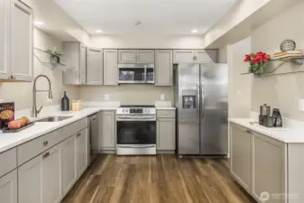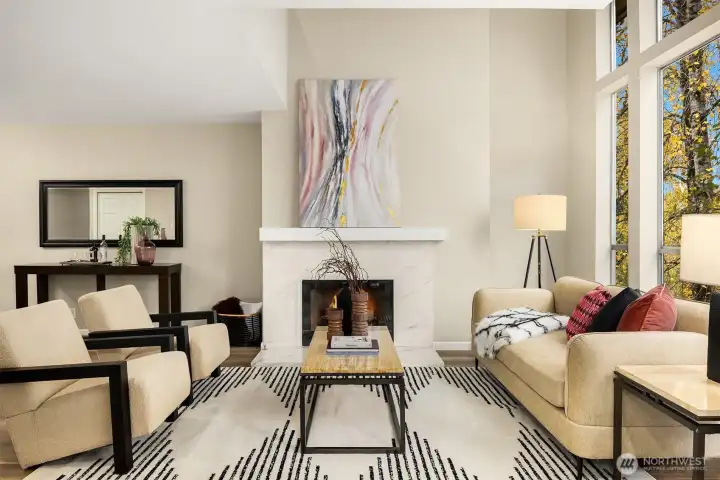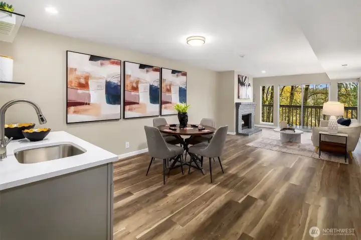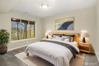 PRICED TO SELL! Perched atop a scenic greenbelt with sweeping territorial views amid the foliage, this turnkey contemporary stunner boasts dramatic architecture, modern luxury finishes & a sprawling 2,573sf floor plan! Desirably nestled in Marymoor Trails, between Grass Lawn Park & downtown Redmond, this unique 2-story townhome with daylight basement is a rare & sought-after find. Impressive foyer with cascading open staircase. Grand living room with soaring windows & quartz gas fireplace opens to formal dining, massive kitchen & entertainment balcony. Lofted primary suite with vaulted ceilings & lavish bath. Lower level with 3rd bed, 3rd bath, 2nd laundry, kitchenette & huge family room with fireplace, oversized windows & private deck. 2-car garage & A/C!