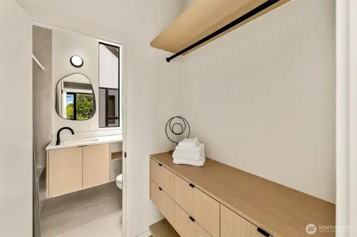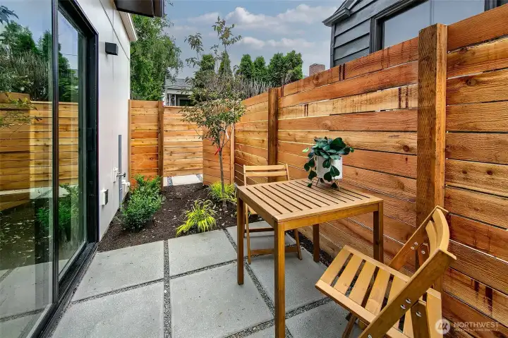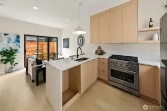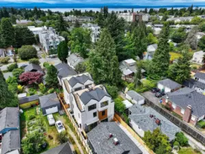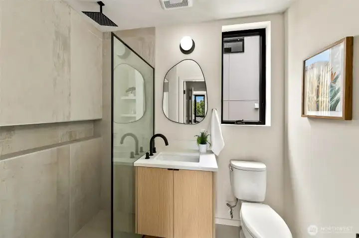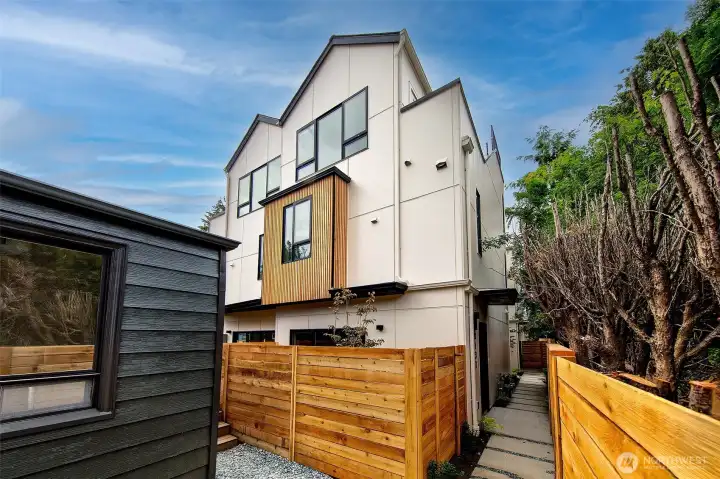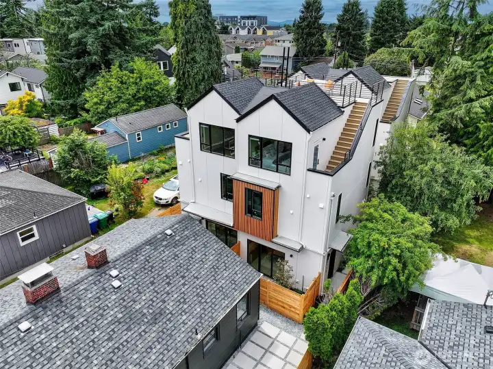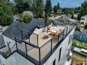 New construction modern Crown Hill townhouse with a private rooftop deck, sweeping city views, and designer finishes throughout, located just minutes from Ballard, Greenwood, and Golden Gardens. This beautifully designed 2-bedroom, 2.5-bath home offers approximately 1,100 sq ft of bright, functional living space with an open-concept main level featuring hardwood floors, vaulted ceilings, and a chef-inspired kitchen with quartz countertops, sleek modern cabinetry, and a premium 6-burner gas range, plus a convenient powder room for guests. Each bedroom occupies its own private level and includes an en-suite bathroom, offering ideal privacy and flexibility for guests, roommates, or a home office. Energy-efficient mini-split systems provide heating and A/C on every floor for year-round comfort. Enjoy both a private patio and a stunning rooftop deck with expansive Seattle skyline views—perfect for entertaining or relaxing. Quality craftsmanship and modern finishes throughout. Ideally located near neighborhood cafés, restaurants, breweries, parks, and transit with quick access to Ballard, downtown Seattle, and major commuter routes. Two homes remain available.