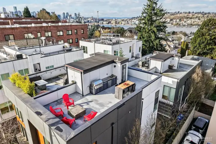 Experience modern city living in this stunning 3 bed 2.25 bath townhome perfectly situated in the heart of North Capitol Hill. Just steps from vibrant neighborhood shops, acclaimed restaurants, and lively cafés, this exceptional home also offers effortless access to downtown, the Eastside, major freeways, and convenient transit options. Inside, a light-filled, open-concept floor plan welcomes you with expansive windows that bathe the home in natural light. The chef-inspired kitchen is a true centerpiece, featuring a generous island with a striking thick quartz waterfall countertop, sleek modern cabinetry, and a premium KitchenAid appliance package—perfect for entertaining or everyday living. Retreat to the spacious primary suite, complete with a luxurious mud-set walk-in shower designed for a spa-like experience. Throughout the home, you'll find elegant hardwood flooring on the main and upper levels, along with stylish open wood staircases accented by contemporary metal railings. Crowning the home is an incredible rooftop deck—your private urban oasis—equipped with a sink, gas grill hooked up, and sweeping panoramic views of mountain ranges, space needle and South Lake Union, ideal for outdoor dining, entertaining, or simply enjoying the skyline. This beautifully designed modern townhome also includes a private garage, offering both convenience and comfort in one of Seattle’s most sought-after neighborhoods.