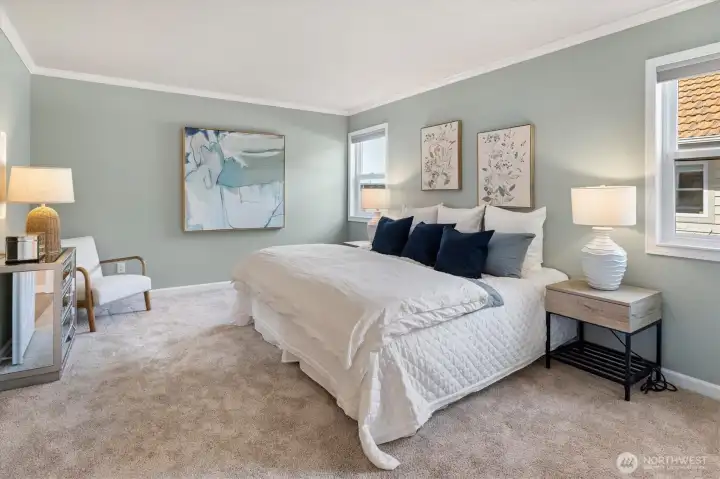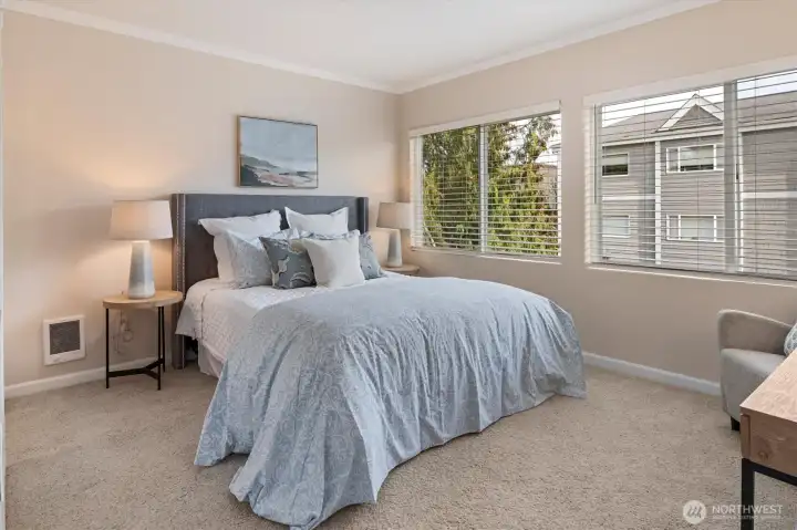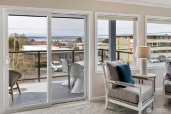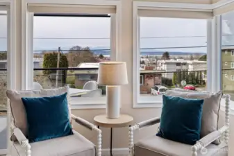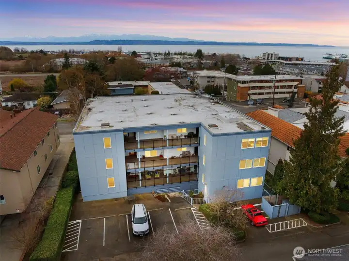 Experience the ultimate lifestyle in the heart of the Edmonds Bowl. This expansive, 1,500+ square foot corner unit offers stunning views of the Puget Sound, the Cascades, and flickering ferry lights. Large updated, open gourmet kitchen featuring new quartz countertops, a subway tile backsplash, and stainless steel appliances. This kitchen was built for cooking and entertaining. The primary suite serves as a private retreat with a remodeled bath and walk in closet, while the detached third bedroom - with its own entrance and 3/4 bath - offers endless flexibility as a guest suite, quiet home office, artist's studio or anything you want it to be! Light and open - a very cheerful home! New paint and carpet. Step through sliding doors to your own private entertainment deck, or stroll just blocs to the Edmond's bowls best cafes and shops. Secure garage, elevator access, zero stairs, newer siding and windows, pet friendly and a rock solid HOA