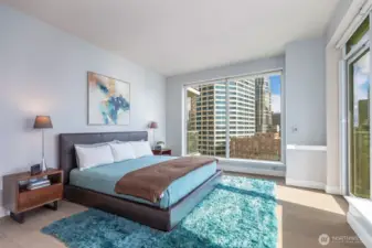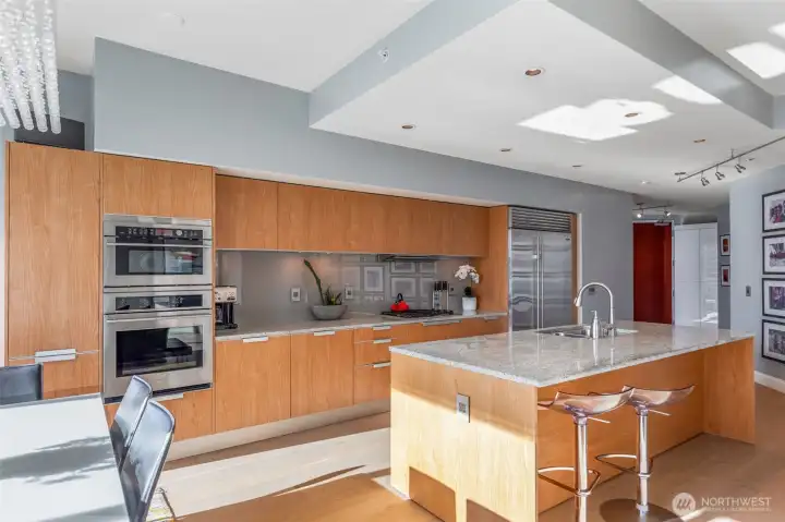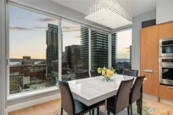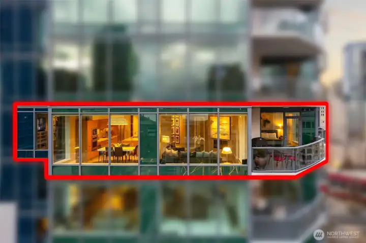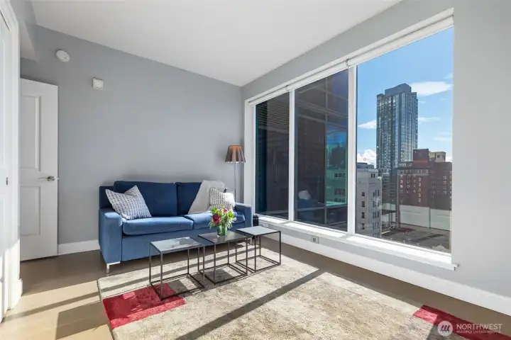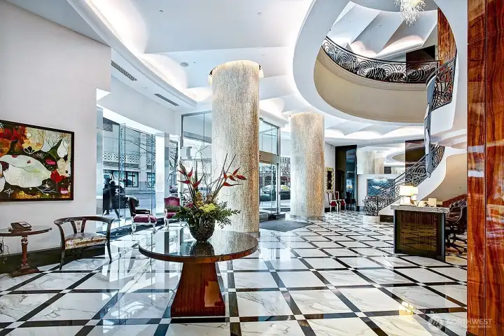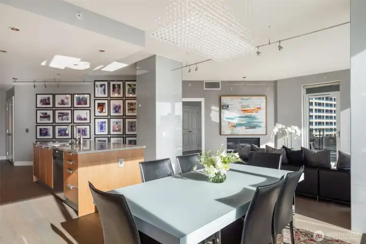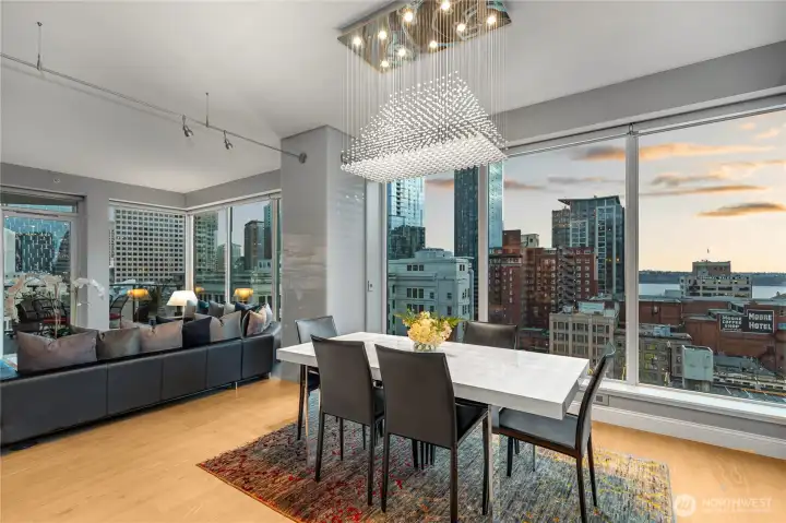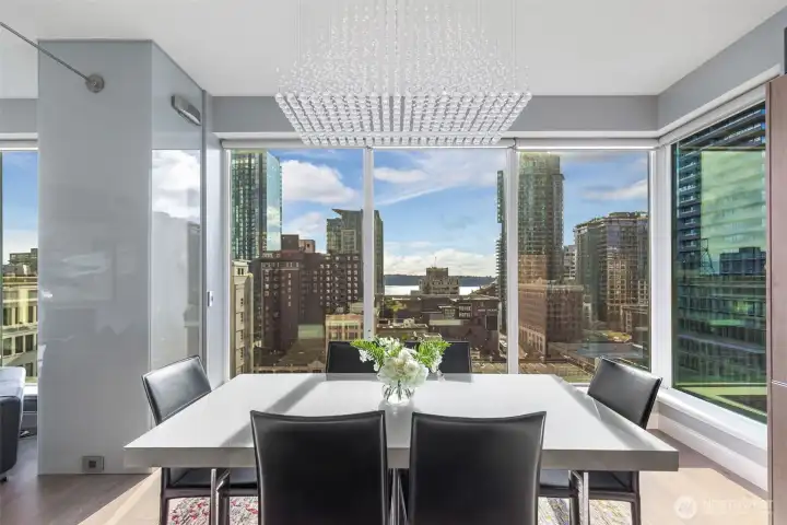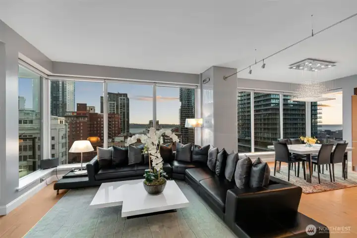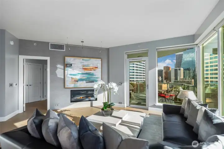 A beautifully positioned southwest corner residence at Escala, offering 1,607 square feet of thoughtfully refined interiors and expansive city outlooks. This two-bedroom (plus efficient office) home is filled with natural light and designed for both everyday ease and elevated entertainment. Arrival is discreet, with elevator access to a semi-private vestibule and your front door. Inside, the floor plan unfolds with intention: Updated flooring, a sleek contemporary fireplace, and resurfaced columns add to the architectural texture and depth. The kitchen anchors the home, flowing naturally into generous dining and living spaces that accommodate intimate evenings or larger gatherings with equal ease. Just beyond, a large private balcony offers extended living space with fresh air and views of Puget Sound. The primary suite exudes scale and separation, while the second bedroom with adjacent bath means flexibility: guest quarters, additional workspace or media room. Two secured parking spaces (one with EV charger) and dedicated storage complete the offering. Escala residents enjoy 24-hour concierge service, a fitness center with tread pools and yoga studio, spa treatment areas, private dining room, event space and commercial kitchen for your large events, theater, outdoor terrace, and dog run. Moments from Pike Place Market, with convenient access to world-class employers, the Monorail, and light rail, this is city living — sophisticated, connected, and effortless. Come see it!