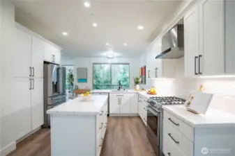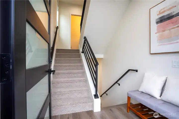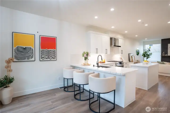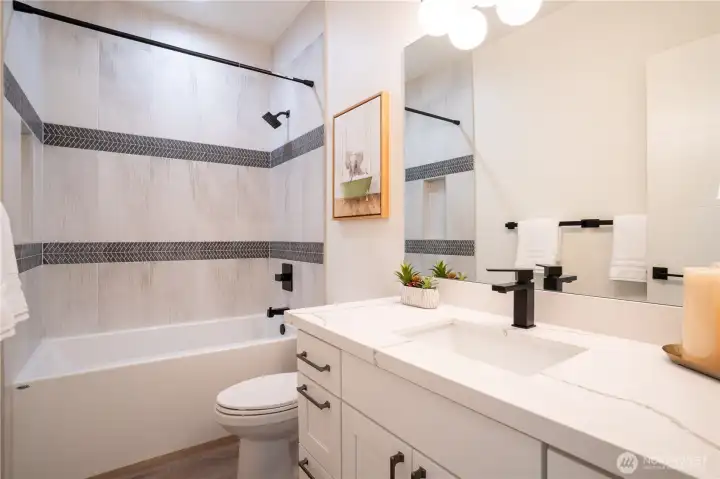 Stylish and spacious home in the desirable Arbor Mist Village community, offering modern finishes and greenbelt privacy with convenient access to Whole Foods, light rail, and Alderwood Mall. This well-designed home features 4 bedrooms plus a bonus/rec room, 3.5 baths, and a 2-car garage. The bright island kitchen includes white shaker cabinets, quartz countertops, stainless steel appliances, and an open layout ideal for everyday living and entertaining. Primary suite offers a designer tiled walk-in double shower with glass doors and a spacious walk-in closet. Enjoy covered decks, a fully-fenced backyard backing to a peaceful greenbelt, and a welcoming front porch. Additional features include 9-foot ceilings, 7-foot doors, a heat pump with A/C, on-demand gas water heater, LVP flooring, fully tiled bathrooms, and window coverings. Convenient commuter location with nearby light rail and easy access to I-5 and I-405. Whole Foods is just across the street, with Alderwood Mall, dining, and everyday conveniences minutes away, while the home remains tucked inside a quiet residential community.