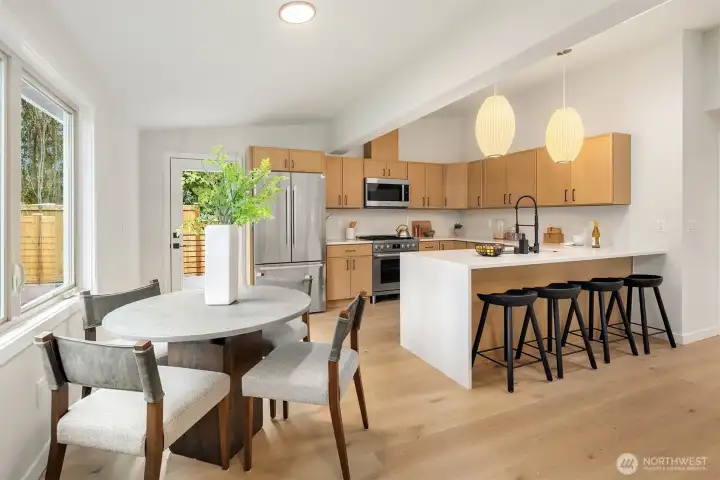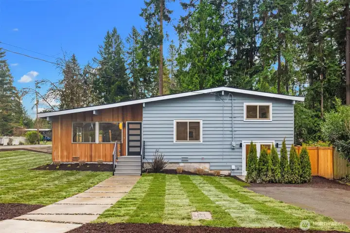 A refined, fully remodeled 4-bedroom residence offering elevated design, modern systems, and effortless comfort. Set on a quiet, light-filled corner lot in Kirkland. This open-concept home has been thoughtfully curated with premium finishes and a seamless indoor-outdoor flow, ideal for both entertaining and everyday living. The heart of the home features a Bosch Pro gas range and full Bosch appliance package, complemented by designer lighting, crisp architectural lines, and engineered hardwoods throughout. Heated bathroom floors add an understated layer of comfort, while efficient ductless mini-split heating and cooling delivers zoned, modern climate control. Extensive upgrades include a new roof, all-new electrical, and new plumbing providing both luxury and long-term peace of mind. Outside, composite decking with custom railings creates a polished extension of the living space, perfect for hosting or unwinding. Positioned on a quiet street and enhanced by its corner-lot setting, the home is filled with natural light and offers a rare blend of thoughtful craftsmanship, modern performance, and refined Kirkland living