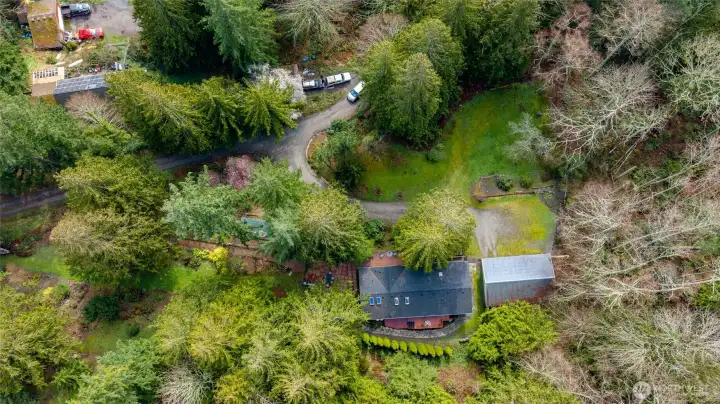 Refreshed and move-in ready home with brand-new carpet, newer roof, fresh interior paint throughout, and exterior painting scheduled as weather allows (siding currently bare where recently replaced for a clean updated look).Discover your private 2.10-acre sanctuary, tucked away from neighbors yet just minutes from Clear Lake and town conveniences. A spacious 3-bay detached garage provides 864 sq ft of versatile space—ideal for vehicles, projects, or storage.Step onto expansive large decks front and back, perfect for morning coffee, al fresco dining, or unwinding with views of the lush surroundings. The beautifully landscaped grounds feature mature trees and ferns lining charming stone pathways, level grassy areas for play or gardening, and gentle slopes leading to a charming multi-purpose shed.Your serene, wooded escape awaits!