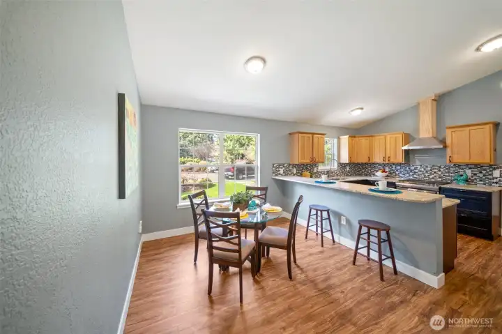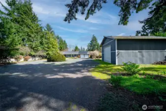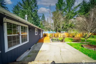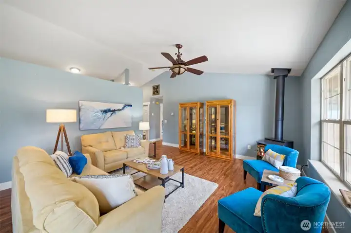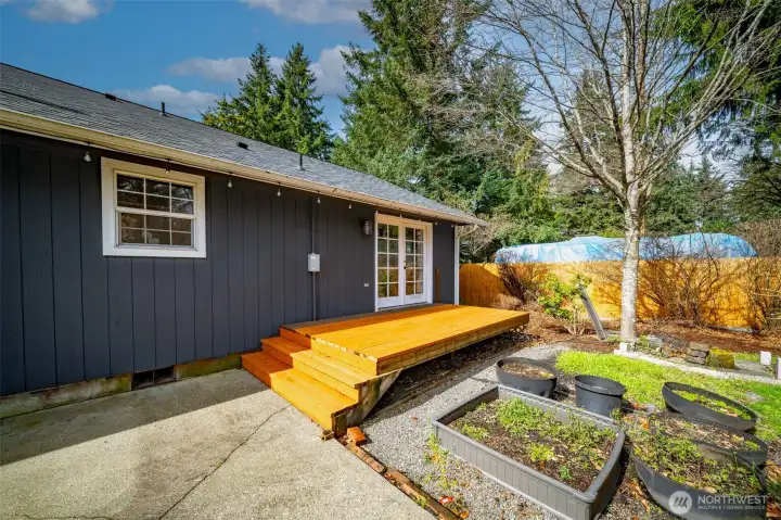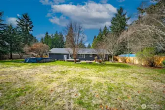 Charming well-maintained rambler on .93 +/- acres! Updated kitchen with granite counters, tile backsplash, stainless appliances, breakfast bar, and dining area. Vaulted ceilings create an open feel through the kitchen and living room, with hard-surface flooring throughout. Spacious primary bedroom with French doors leading to the deck. Comfort features include ceiling fans, central A/C, propane freestanding stove, and solar panels. Enjoy the huge fully fenced backyard with mature trees, above-ground pool, and plenty of space to garden. Extra-large 2-car garage plus 24×36 shop and RV parking—room for all your toys!