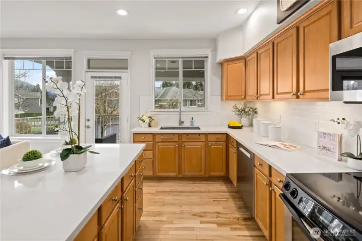 Immaculate end-unit townhome in Aspen Village at Snoqualmie Ridge with stunning Mt. Si and Cascade Mountain views. This former model home offers exceptional privacy, abundant natural light, and thoughtful upgrades throughout. The open kitchen features stainless appliances, updated finishes, an island with eating space, and flows seamlessly into the living area with a cozy gas fireplace, perfect for entertaining. Rich maple hardwood floors and designer touches create a warm and inviting feel. The spacious primary suite captures breathtaking mountain views and includes a luxurious 5-piece bath, while the second bedroom features its own private en-suite bathroom, ideal for guests or roommates. Stay comfortable year-round with newer A/C and enjoy rare flexibility with a 3-car tandem garage complete with a workbench, perfect for gear, hobbies, a home gym, or office space. Located within walking distance of Snoqualmie Ridge Town Center, you’re close to restaurants, coffee shops, breweries, wine bars, parks, and miles of scenic trails, plus The Club at Snoqualmie Ridge golf course just blocks away. Bonus: Take advantage of a 2.75% assumable FHA mortgage, an incredibly rare opportunity in today’s market.