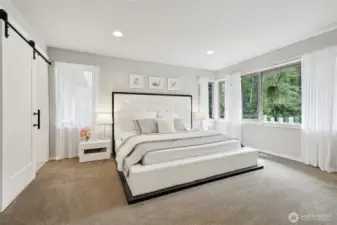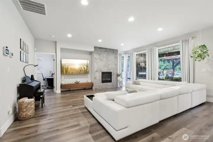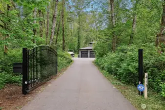 Peace & privacy awaits! This gated 6.5-acre estate features a stunning contemporary home designed for modern living. The open floor plan showcases floor-to-ceiling windows & designer touches throughout. The chef’s kitchen shines w/ white cabinetry, quartz waterfall island, & stainless appliances. Wide-plank flooring & recessed lights complete this stylish, nature-inspired retreat. A covered outdoor living space includes a sleek stone fireplace, wood-paneled ceiling, & dual fans - perfect for year-round enjoyment. The spa-like primary bath offers a soaking tub, dual vanity, hex tile backsplash, & large-format floors. Don't miss the spacious 3-car garage & fresh landscaping. There is even room for a shop or RV parking!