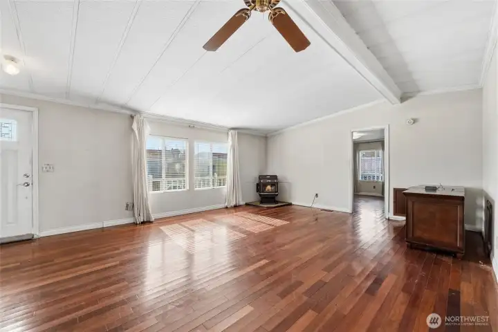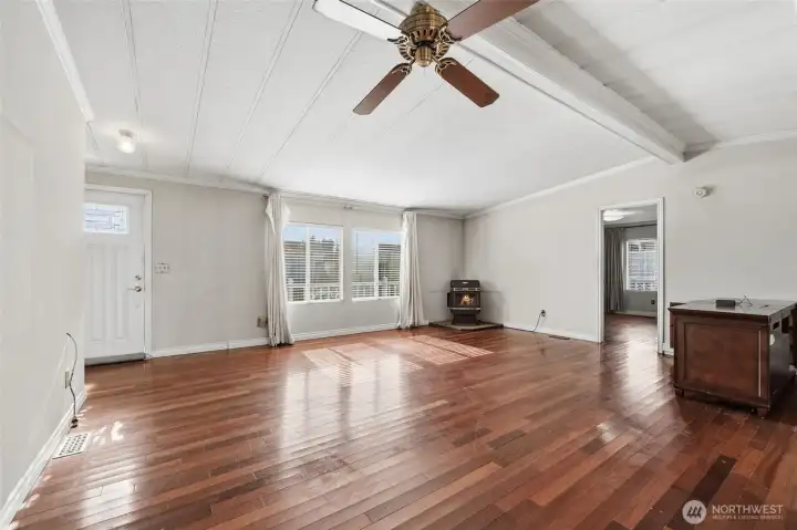 Enjoy relaxed 55+ living in this well-cared-for home ideally located near Oak Harbor’s beaches, shopping, and scenic waterfront trails. Elevated views capture beautiful morning light along with sweeping city, water, and mountain outlooks. Inside, the 1,248 sq ft layout offers a comfortable open living space with vaulted ceilings, large windows, and a pellet stove that adds warmth and charm. The kitchen sits adjacent to a casual dining nook and offers generous built-in storage. The floor plan includes 3 bedrooms positioned for flexibility and privacy along with 2 full baths. Outdoor living is easy with a spacious front deck perfectly positioned to take in the views. Additional features include forced air heat, all appliances included, interior and exterior storage, two parking spaces, and a storage shed. Space rent includes water, sewer, garbage, and clubhouse access. Welcome Home!