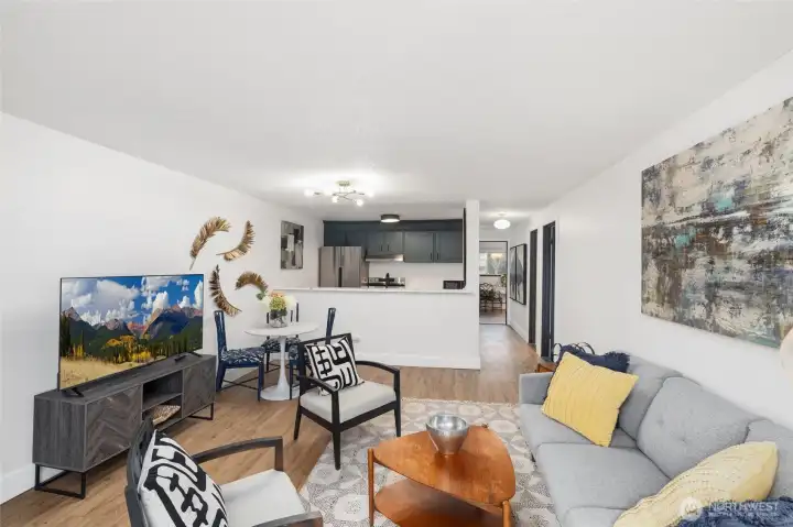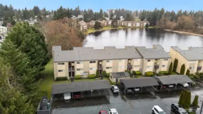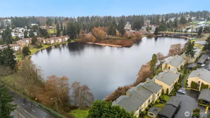 Beautifully updated 2 bed, 2 bath lakeview end unit condo with modern finishes throughout! Bright open living spaces featuring- new flooring and a striking mid-century style fireplace wall. Stylish kitchen with NEW quartz countertops, modern tile backsplash, updated cabinetry and stainless appliances. Spacious primary suite with private en-suite bath and additional bedroom has balcony access overlooking the lake- this second bedroom is perfect for guests or home office. There are 2 balconies and both have peaceful lake views. The community amenities include clubhouse, exercise room and outdoor pool. There is an assigned covered parking located directly in front of the unit and plenty of additional or guest parking. Convenient location-just minutes to new light rail transit center and near plenty of shopping and dining places.