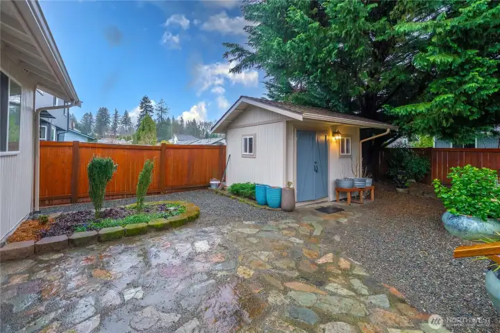 This beautifully renovated Maple Valley rambler offers single-level living at its finest. Thoughtful changes to the original design included the fully-permitted addition of a lovely 16'x18' (288sf) family room/gathering space with a light-capturing bay window to the back of the house. Also part of the renovated vision was a fully remodeled, conversational kitchen with a cooktop island, & the expanded primary suite's private bath with a walk-in closet, a double-sink vanity, & a combination shower/soaking tub. This home is a gardener's paradise: come discover the private slate patio & garden shed complete with cooling and power. Enjoy container gardening on your north-facing front deck & 4 seasons of thoughtfully selected plants along the property's easy-care flower beds. Enter the house with a high-vaulted ceiling, open-concept, gas fireside living room, kitchen, & dining area. Three bedrooms provide plenty of room for office space & guests. There are engineered hardwood floors throughout. Both bathrooms have been completely updated, including travertine tile floors & tile showers. The water system is complemented by a "Water Doctor" water treatment system that stays with the house. The 480sf garage includes a laundry area & a raised dog bath. Maple Valley offers the best of community living, with easy access to groceries, health care, & award-winning schools, while also offering a respite from the hustle & bustle of the city. Easily commute via Hwy 18, just 5 minutes away.