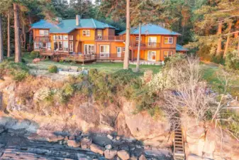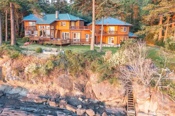 STUNNING NORTH SHORE WATERFRONT PROPERTY Just minutes from Eastsound, drive through a preserved forest and arrive at this private quintessential Orcas home with 180° views from Mt. Baker to Waldron Island and 169' of accessible beachfront. Extraordinary quality throughout this meticulously maintained 4,014 sq ft home with great room, gourmet kitchen, dining room, sunroom, family room, 2 bedrooms, office, sitting room and 3-car garage. Attached 2-bedroom guest space with full bath, kitchen and living room. Fully landscaped with lawns in the front and back, fenced garden and mature fruit trees. Spacious decks to enjoy the ever-changing vistas. Descend the blue stone steps to the landing created by a local artisan, and explore tidepools below.