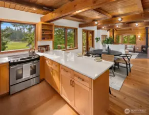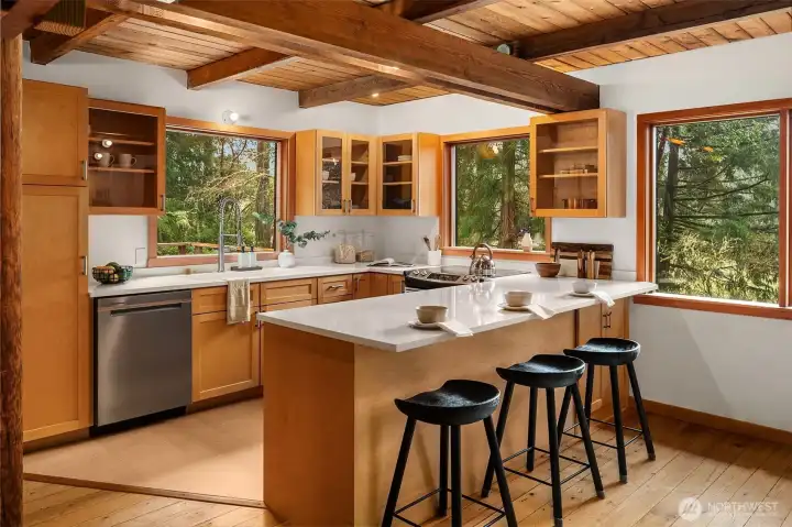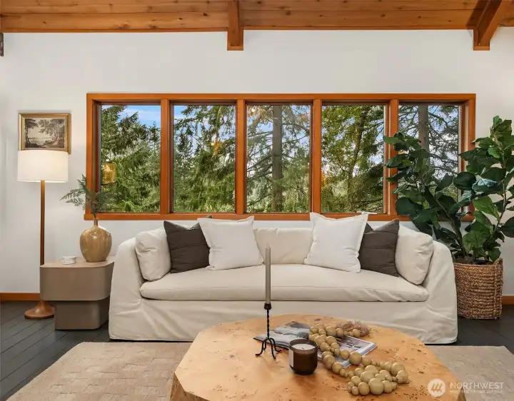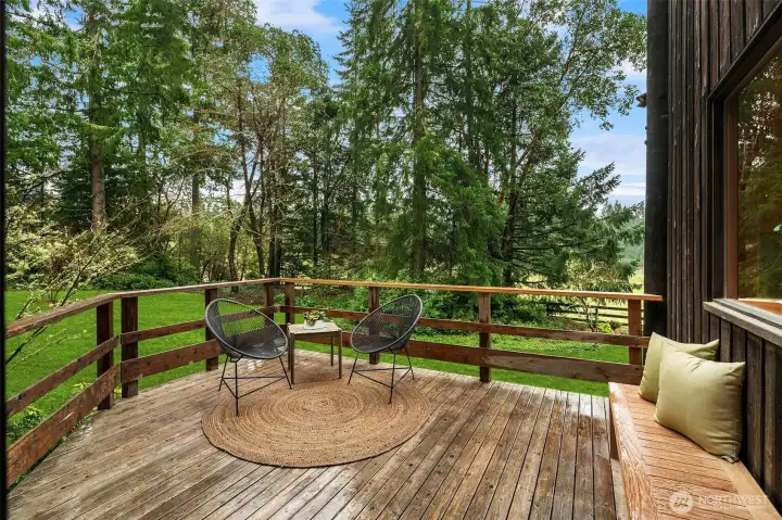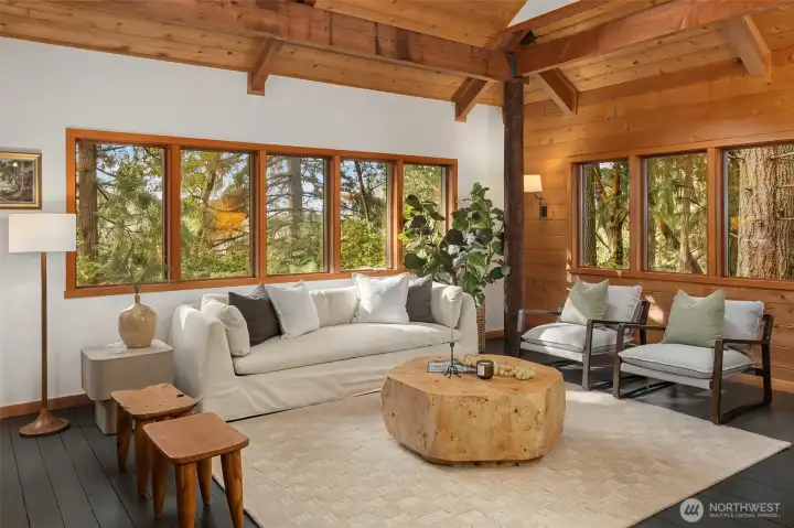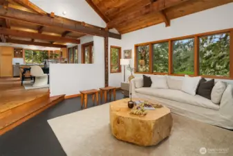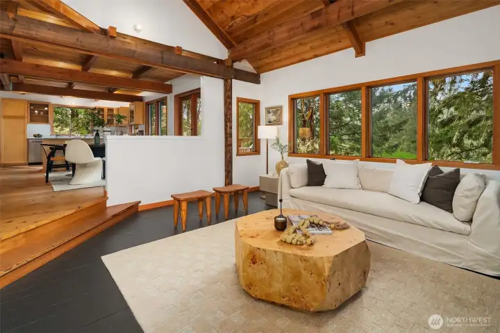Set on 2.7 private acres in central Misty Isle, across from acres of King County parkland, this beautifully remodeled wood-sided home is a rare blend of Northwest modern design, warm natural materials, and an exceptional Vashon Island setting. Level lawns, beautiful trees, and abundant natural light create a property that feels both peaceful and expansive, with privacy, sunshine, and easy access to town, schools, and both ferries. Inside, vaulted ceilings rise above fir and spruce tongue-and-groove floors, CVG Douglas fir trim, clear-finish wood doors, and warm pine paneling, giving the home a soulful, grounded elegance. Fully remodeled by Corey McIntyre Construction, the 3-bedroom, 2-bath layout includes a custom kitchen with painted Omega shaker cabinetry, quartz counters, farmhouse sink, and beautifully updated baths with reclaimed wood vanities, stone counters, tiled showers, and a soaking tub. New heating and A/C system, private well, irrigation, detached one-car garage, and a 560-square-foot detached studio with electricity add comfort and flexibility for work, art, fitness, or guests. The neighboring 4.5-acre parcel of rolling fenced pasture is also available for sale, offering a rare opportunity to expand the estate. A private, design-forward island retreat in one of Vashon’s most coveted locations.