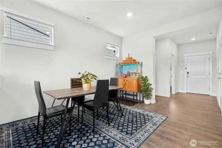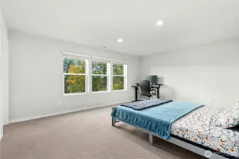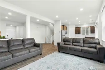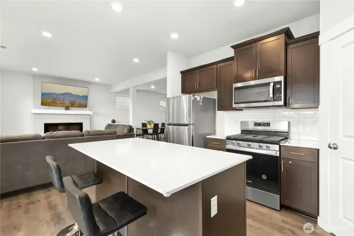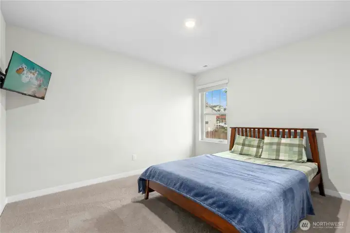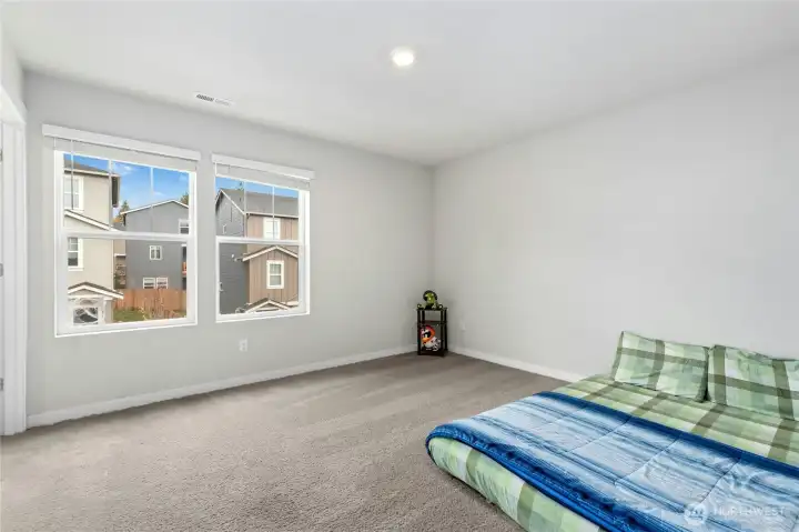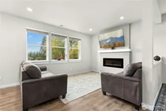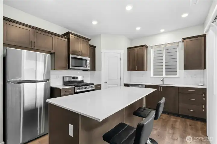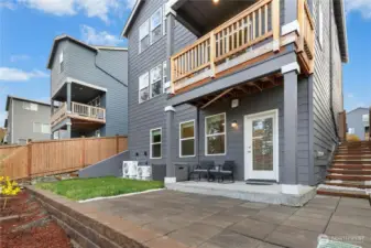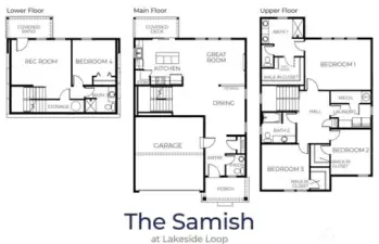 The Samish Plan is a stylish southeast-facing two-story home with a daylight basement, offering 4 bedrooms and 3.5 baths. Its open-concept design features a spacious living room flowing into a stunning kitchen with a large island—perfect for cooking, dining, and entertaining. The luxurious primary suite boasts a spa-like bath and generous walk-in closet, while upstairs bedrooms also include walk-ins for added convenience. The lower level offers a bedroom, ¾ bath, and a versatile rec room ideal for guests or a home office. The backyard is upgraded with paver stone flooring, a custom retaining wall, lush grass grass to maintain a natural backyard feel, and wooden stairs accented with white decorative stones.