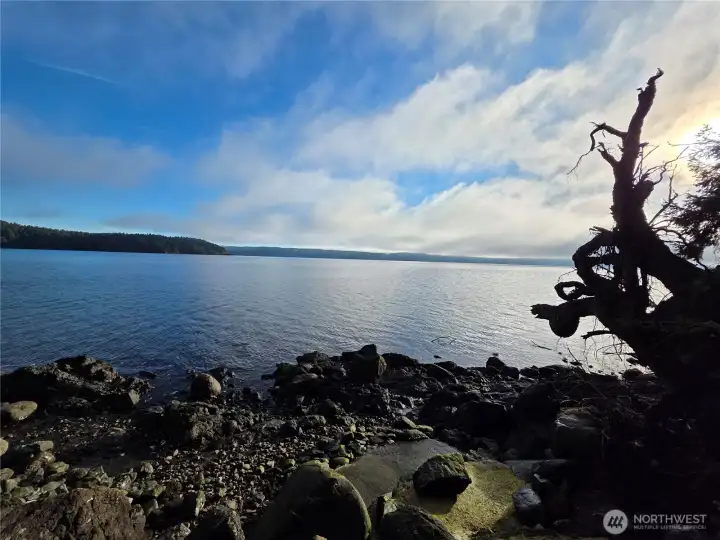 Charming waterfront home overlooking the entrance to Jackson Cove on Hood Canal. 3 bedroom, 2 bath, with large living room, kitchen, laundry room and inside stairs down to the 2-bay garage. Primary bedroom, living room, dining room, and kitchen all have stunning water views. Primary bedroom has en suite bathroom and a sliding glass door to step onto the patio. Listen to the sound of the waves while you sip your morning beverage and relax on the large patio or deck perched out over Hood Canal. Property also has a detached shed with sink, fridge, power, and a lovely view of canal perfect for outdoor entertaining. Large RV or boat parking with water hookup and an additional full RV hookup. An approximate 40 ft metal stairway to your private beach and owned tidelands for fresh shellfish, swimming, boating, etc. Located in a quiet neighborhood surrounded by evergreens. Only 7 miles away from Pleasant Harbor Marina and just a short drive to the Duckabush and Dosewallips Rivers and local hiking trails.