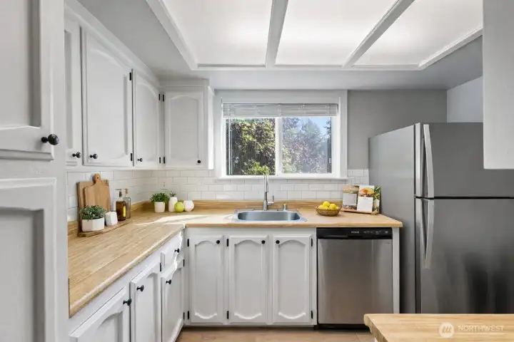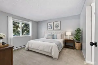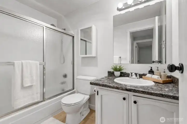 Welcome to effortless Northwest living in this beautifully updated 2 bedroom 2 bath 954 sf residence tucked within the picturesque Village by the Lake community where modern comfort meets peaceful lakeside living!A light-filled interior welcomes you with luxury vinyl plank flooring and inviting open floor plan boasting spacious living and dining rooms plus cozy woodburning fireplace.Seamless access to private deck with territorial views is an ideal space to unwind and enjoy quiet mornings or summer evenings. The bright kitchen showcases abundant cabinetry and all appliances, combining practical design with comfortable everyday living. Primary suite features a private bath and generous closet space. A second bedroom and full bath provide flexibility for guests or a home office, while in-unit full size washer and dryer provide added convenience. Village by the Lake offers exceptional community amenities including access to Beverly Lake, an outdoor pool, athletic court, clubhouse, game room, lakeside picnic areas and miles of scenic trails to explore. Nature lovers will appreciate the tranquil setting and wildlife. Ideally located just minutes from Everett Mall, dining, shopping, and major commuter routes, with easy access to I-5, Boeing, Mukilteo and the Everett waterfront. Reserved parking space and ample guest parking. HOA dues include water, sewer, garbage. No rental cap. Exceptional lifestyle appeal and investment potential. A hidden gem in the heart of Everett!