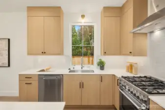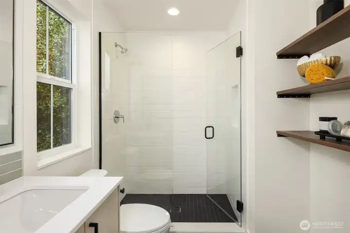 Exceptional new construction cottage by Gerry Homes in East of Market, offering refined design, elevated finishes and a spacious fenced backyard. A charming porch welcomes you to the gracious main level featuring bright & airy two-story living room, with open concept dining and kitchen with gas range. Unique main floor bedroom and ¾ bath offers flexible floor plan. Upstairs showcases two bedrooms, each with en suite baths for ultimate privacy and convenience. Moments to downtown the shopping and dining of downtown Kirkland, recreation on Lake Washington, & effortless commute throughout the east side. Designated EV off-street parking provides peace of mind at the end of the day.
