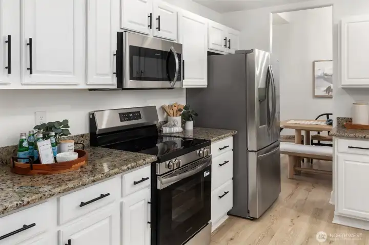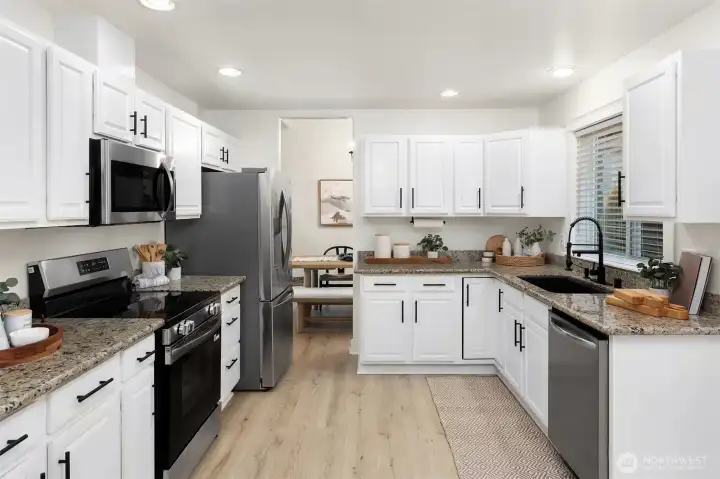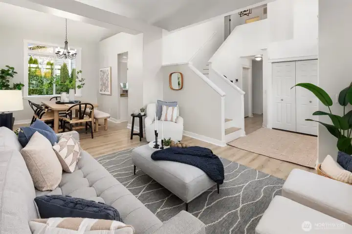 Welcome to this Traditional NW-style 4-bedroom, 3-bath residence with a spacious 3-car attached garage, offering timeless design and thoughtful updates. The home features a traditional layout with a welcoming entry, formal living and dining rooms, and entertaining spaces. The kitchen opens to the inviting family room with a cozy gas fireplace—ideal for everyday living and gatherings. A main-level bedroom offers flexibility and is perfect for guests or a home office. Upstairs, the spacious primary suite serves as a private retreat with a five-piece bath and walk-in closet. Updates include new LVP flooring, a new roof, refreshed landscaping, new front door, updated bathrooms, cabinetry and fixtures, upgraded chandeliers, and fiber-to-the-home (FTTH) internet. Major appliances replaced include the dishwasher, washer, dryer, refrigerator, oven, and stove. The home has recently undergone installation of new stairs to the back patio, partial driveway replacement, professional window cleaning, exterior pressure washing, and full interior professional cleaning—making it move-in ready. A vacation lighting timer system adds ease and peace of mind. Ideally located just minutes from Fred Meyer, I-5, Alderwood Mall, Boeing, and Mukilteo Beach, offering access to shopping, commuting routes, and waterfront recreation.