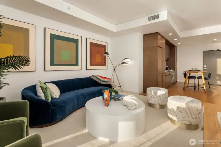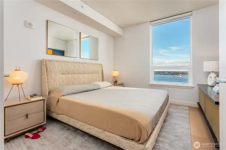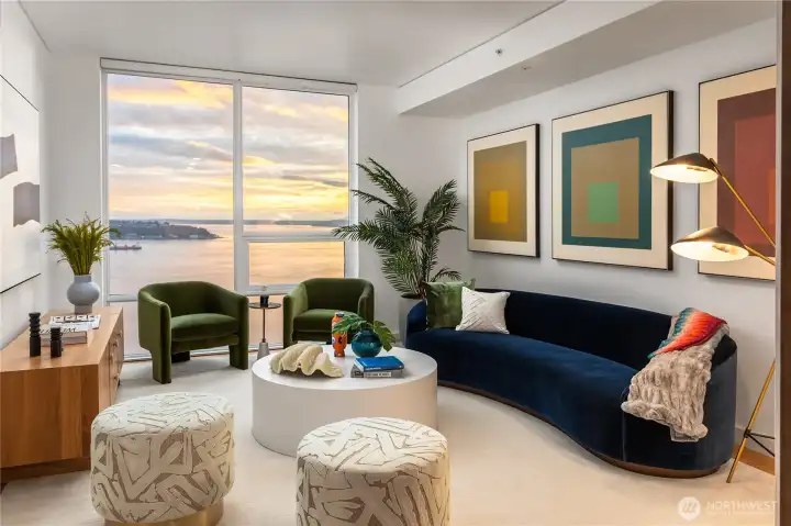 Experience the pinnacle of urban waterfront living. This sophisticated residence offers a direct west-facing orientation, featuring floor-to-ceiling windows that capture unparalleled, unobstructed views of Puget Sound and the majestic Olympic Mountain sunsets. The interior showcases premium modern craftsmanship, including high-end Miele appliances, custom wood cabinetry, and sleek wood flooring throughout. Residents enjoy world-class amenities at The Emerald: a 24/7 concierge, a state-of-the-art fitness center, and the breathtaking 39th-floor rooftop 'Olympic Room' lounge with its expansive outdoor terrace. Perfectly positioned just one block from Pike Place Market and the new waterfront, this home defines the ultimate blend of iconic scenery and metropolitan convenience.