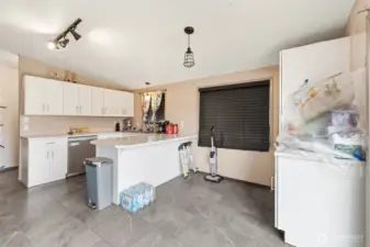 Tucked away on the quiet dead-end portion of West 13th, this mid-century inspired home offers a fantastic opportunity to build sweat equity in a solid, well-laid-out property. Concrete walkways lead to a fully fenced yard stretching from front to back, complete with gated alley access for added convenience. Inside, vaulted ceilings and a wood accent wall create an open, character-filled living space. The kitchen has already been thoughtfully updated with modern cabinetry, countertops, and tile flooring, and features a peninsula for casual seating along with a dining area that opens to the front deck through a sliding door. The flexible floor plan includes three bedrooms and one and a half baths, with the primary bedroom offering convenient Jack-and-Jill access to the half bath and nearby laundry area. A shared full bathroom serves the additional bedrooms. At the back of the home, a spacious rec room with fireplace opens to a concrete patio through another sliding door, perfect for indoor-outdoor living and easily adaptable as a fourth bedroom, guest space, or bonus room. Two ductless heat pumps provide efficiency from either end of the house, and vinyl windows are already in place. An attached one-car garage, fenced yard, and classic mid-century lines round out the property. With strong bones, a great layout, and several key updates already completed, this home is ready for someone to bring their vision and make it shine.