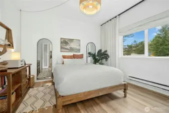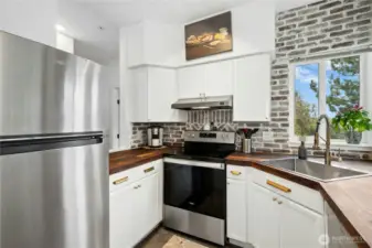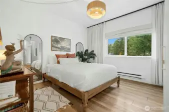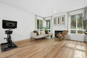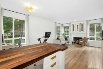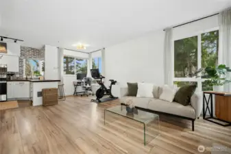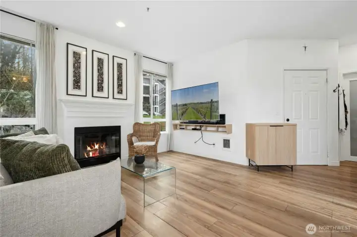 Tucked into a coveted corner position at Cambria Hills, this fully remodeled 1-bed, 1-bath home offers something rare: greenbelt views to the east and treetop sunset views to the west — all 739 square feet thoughtfully upgraded from the ground up. Rich oak laminate floors run throughout, anchored by a kitchen featuring dark walnut wood countertops, a chef's sink, and stainless appliances. The spa-inspired bath is finished to a high standard, and two oversized walk-in closets offers flexible use as a dedicated workspace. West-facing windows bring in generous natural light and evening color year-round. In-unit Maytag washer and dryer. Covered patio with additional storage. Fireplace for cooler months. Two reserved parking spaces. Cambria Hills amenities include a pool, hot tub, fitness center, and clubhouse. Trails, dining, and top-rated Northshore Schools are all close by. No rental cap, low HOA dues, and pets welcome.