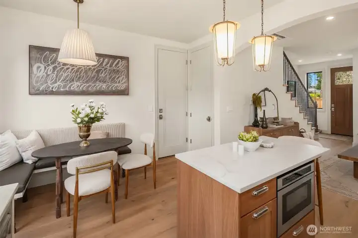 Artisan luxury defines this 2-bed + den Edmonds new-construction built by local Westerly. Old-world charm woven throughout. Open floor plan with arch that gently defines living area from kitchen and dining. Statement kitchen with ochre Zellige tile backsplash, prep island, stainless-steel appliances, quality Bellmont cabinetry, and huge walk-in pantry. Designer touches from living hardware that develops patina over time to upscale lighting. Inviting dining space with custom built-in banquette: furniture-style details and French ticking cushions. Upstairs the primary suite and 2nd bed feature vaulted ceilings. Primary bath and hallway bath blends vintage details with new. Roomy den/office could double as nursery. Built-in bookcase with hidden water heater. Oversized windows and wide-plank oak hardwoods. Golden Age design meets modern livability with too many features to list: mini-split heat pumps, mudroom nook, iron-detailed staircase, fully-fenced turf backyard with Trex deck, heated 1-car garage with space for gym and storage