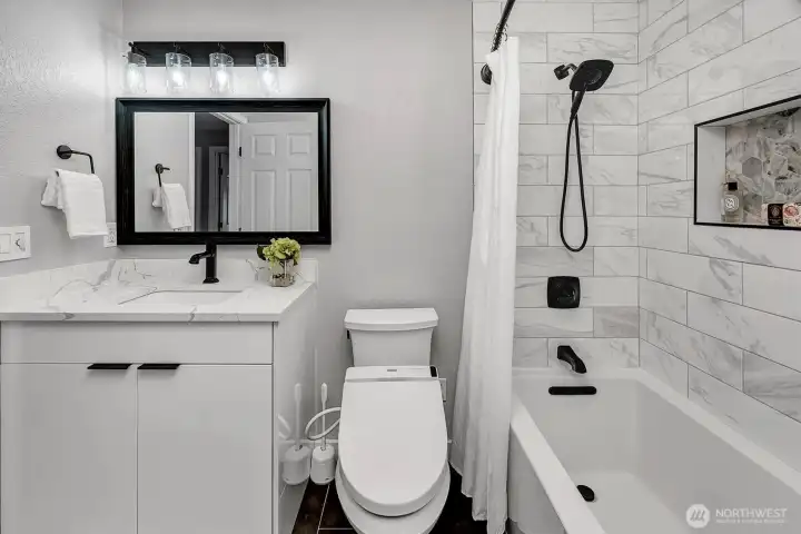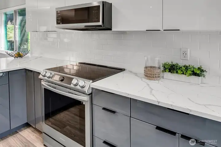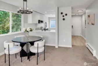 Turnkey top-floor end unit in the highly desirable Cedarwood community, right in the heart of Totem Lake! Set within a recently renovated complex featuring new siding, windows, roof, and major exterior improvements, the community offers fresh curb appeal that feels like new. Beautifully remodeled and fully move-in ready, this stylish home offers privacy, natural light, and modern comfort on a quiet street just moments from everything. Step inside to a thoughtfully updated interior featuring gorgeous kitchen with eating space, sleek European-style two-tone cabinetry, quartz countertops, stainless steel appliances, luxury vinyl plank flooring & a spacious living room with newer carpeting, centered around a cozy wood-burning fireplace. The generous primary suite offers abundant closet space & a fully upgraded bathroom showcasing stunning tile work, modern fixtures and a premium Toto washlet, while the spacious second bedroom adds flexibility for guests, a home office or a workout space. Enjoy year-round outdoor living from your private balcony with peaceful territorial views, extra storage, a premium Traeger BBQ & a striking oversized safe included - rare bonuses! No rental cap makes this a great opportunity for homeowners or investors. Covered parking plus ample guest parking. Ideally located just minutes from I-405 and walkable to The Village at Totem Lake’s shops, dining & entertainment. Furniture/decor may also stay upon request, making this a rare truly turnkey opportunity.