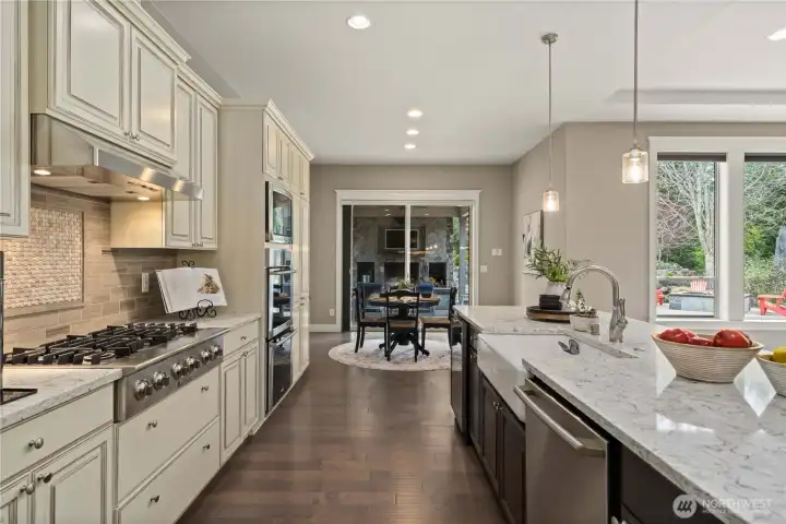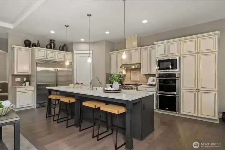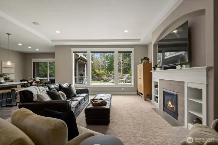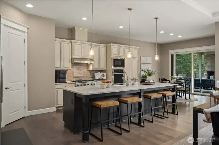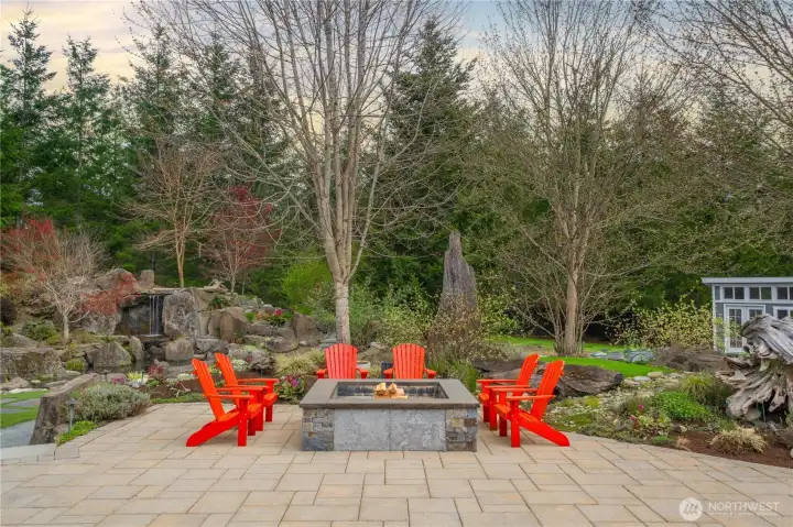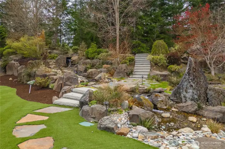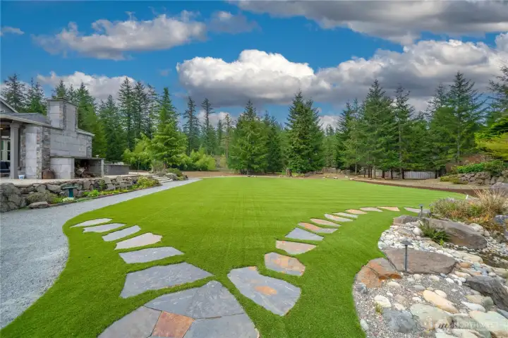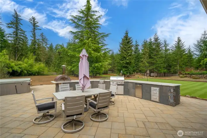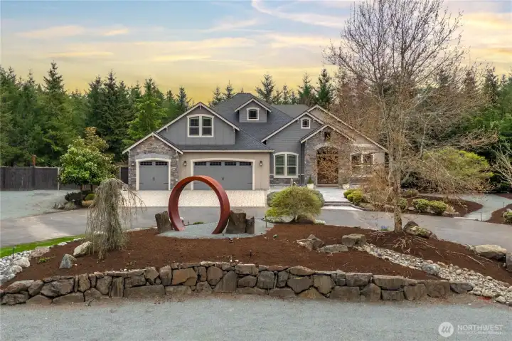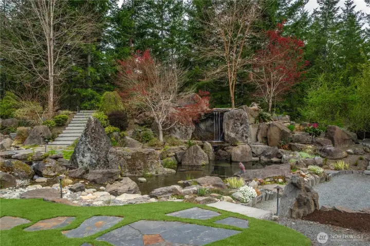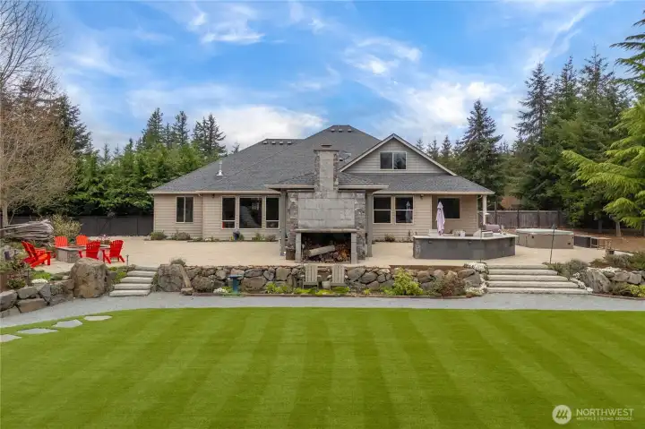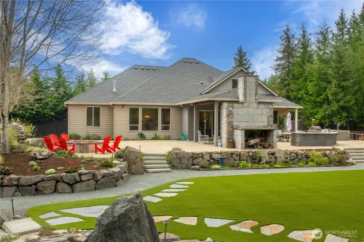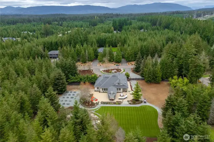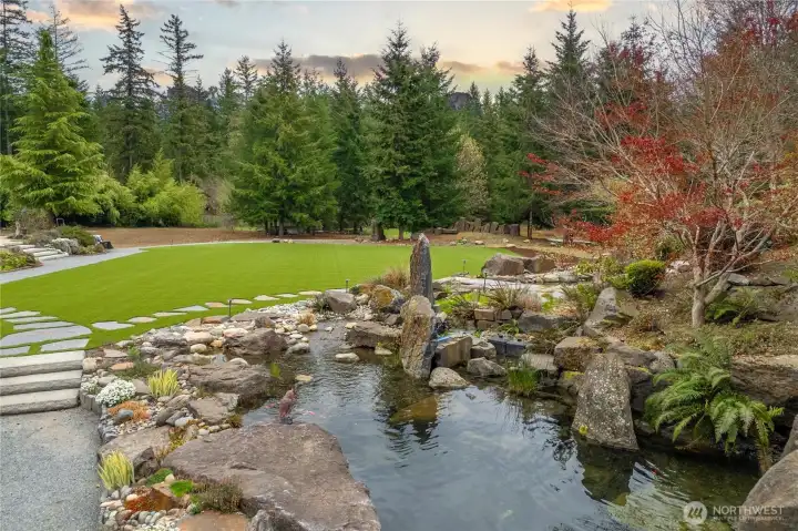 Beyond the gates of Estates at Sugarloaf, this Garrette Custom home unfolds across nearly 3 private acres, offering a rare blend of elevated craftsmanship, resort-caliber outdoor living, and the kind of privacy that feels worlds away. The grounds are nothing short of spectacular, designed for unforgettable entertaining and everyday enjoyment with event-worthy landscaping, a covered outdoor patio with fireplace, heaters, fan, and TV, a fully appointed outdoor kitchen with grill, burners, sink, pizza oven, and refrigerator, a lit sport court, hot tub, tranquil koi pond and waterfall, turf lawn, irrigation, and extensive landscape lighting. The home offers main-floor living with everything you need on the main level, including a beautifully secluded primary suite that feels like a true retreat with a spa-inspired bath and dual-head shower. Soaring 10' ceilings, 8' doors, engineered hardwood flooring, heated herringbone tile, and plantation shutters elevate the main level, while the chef’s kitchen serves as the heart of the home with premium Electrolux appliances, dual ovens, a gas cook top, farmhouse sink, quartz counters, and custom built-ins. Upstairs, a spacious bonus level adds exceptional flexibility with a bedroom, full bath, bonus room, and office space, ideal for multi generational living, game nights, work-from-home needs, or long-term guests. Additional amenities include surround sound, central vacuum, whole-house generator, circular drive, and coveted Tahoma Schools.