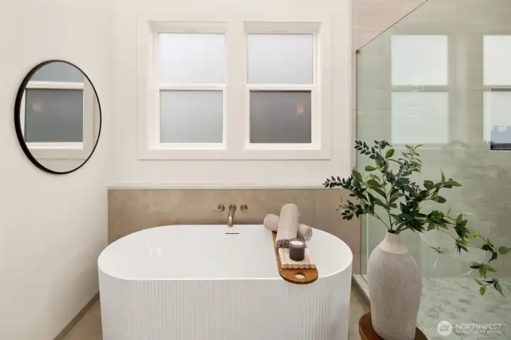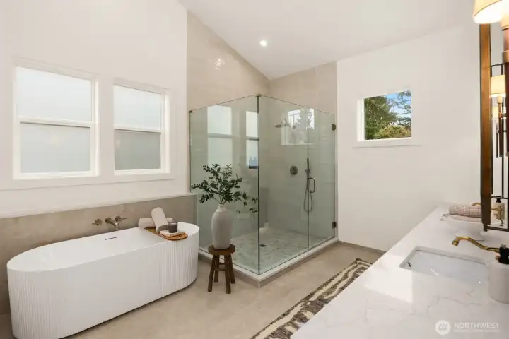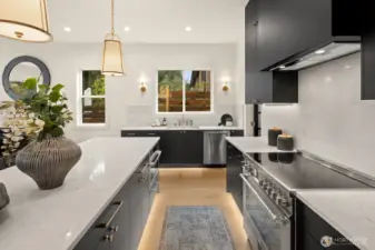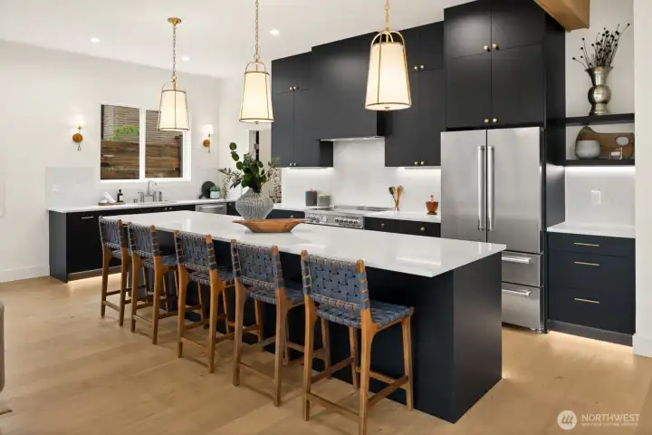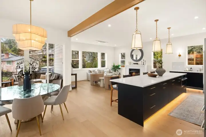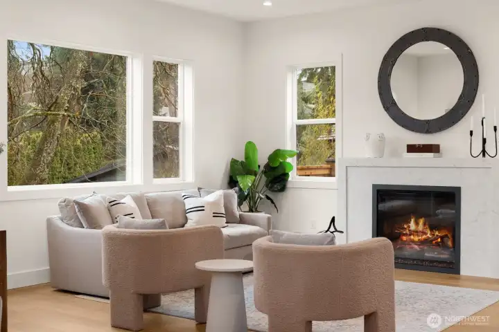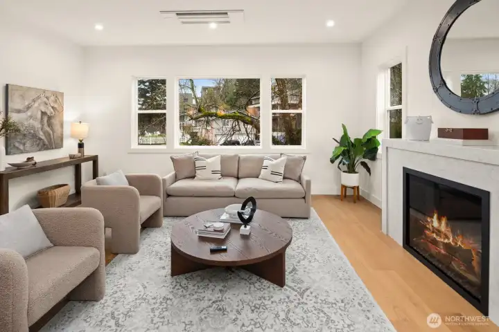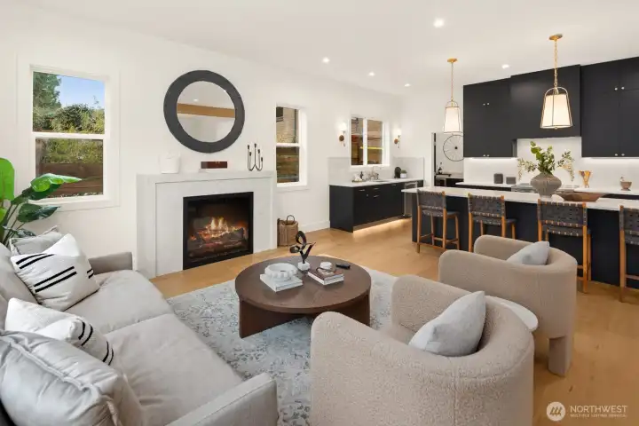 Lausiva Homes presents another beautifully crafted home in Seattle’s North Beach neighborhood —thoughtfully designed with timeless style. A stunning kitchen with Bertazzoni appliances, Brizo Artesso faucet, Abodian cabinetry, butler’s pantry, and wine fridge anchors the main level and flows into the inviting living room with a custom quartz fireplace. The formal dining area opens through expansive sliders to a covered, heated deck and fenced yard—ideal for year-round entertaining. French doors lead to a main-level bedroom or office with nearby ¾ bath. Upstairs, the light-filled primary suite features soaring ceilings and a spa-inspired bath with soaking tub, frameless shower, radiant heat flooring and double vanity. Three additional bedrooms and a versatile loft provide flexible living space. Mini-splits in every room, a spacious laundry room with utility sink and storage, and an attached two-car garage with EV charger and mudroom entry complete the home.