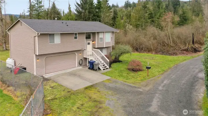 Rare opportunity to own in town on 2+ acres! A unique blend of space, privacy, and convenience—most of the acreage is designated Freshwater Forested / Shrub Wetland, preserving your peaceful surroundings, while nearly an acre remains usable and enjoyable. This beautifully maintained home offers 3 bedrooms and 2.75 baths with an open, inviting main living area. The updated kitchen and bathrooms feature slab granite countertops, stainless steel appliances, and modern finishes throughout. A bay window and cozy gas fireplace enhance the living room, while the kitchen’s eating bar and adjoining dining area create the perfect space for everyday living and entertaining. Step through the sliding glass door onto the deck overlooking the expansive backyard—ideal for gatherings, gardening, or simply relaxing in your own private retreat. The lower level provides a spacious family room with outdoor access and a ¾ bath—perfect for guests, multi-generational living, or flexible use space. Additional highlights include a newer roof & gutters (2024), heat pump (2018), hot water tank (2024), a large two-car garage with workbenches and rear access door, plus RV parking on both sides of the home. All this within walking distance to the library and town amenities, and just minutes from endless outdoor adventures along the Mountain Loop Highway. An exceptional property offering space, updates, and location—ready to call home.