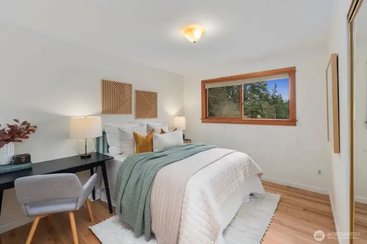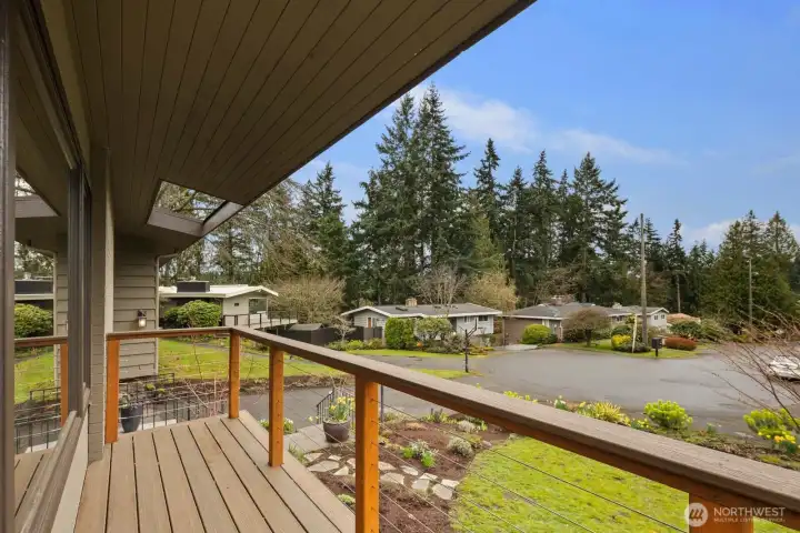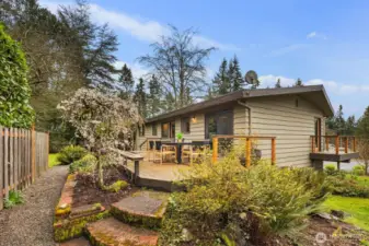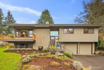 Elegant street appeal welcomes you to this light-filled home, ideally situated on a large lot at the end of the cul-de-sac, with serene territorial views from both the living room and the front and back decks. The thoughtful floor plan is bathed in natural light, featuring spacious living and family rooms, each with a cozy wood-burning fireplace, a recently updated kitchen with additional workspace, and an inviting primary suite. Three bedrooms, including the primary, are conveniently located on the main level, while a lower level bedroom and family room offer a private space for guests or flexible use. The front and back decks is a standout feature, with built-in benches for relaxing and multiple areas designed for entertaining and enjoying the sweeping territorial views. A spacious two car garage provides ample room for parking, storage, and a dedicated work area. Professionally manicured landscaping completes this very well cared for and updated property.