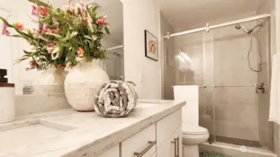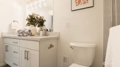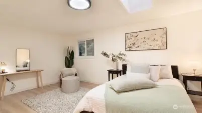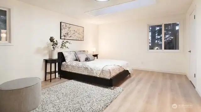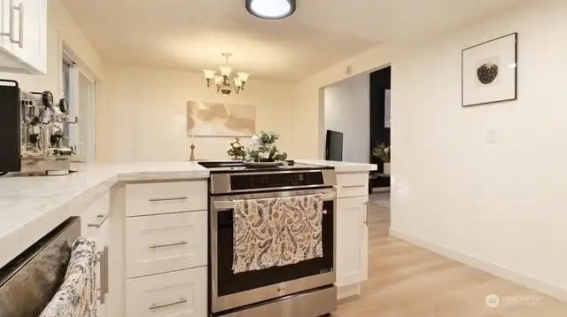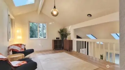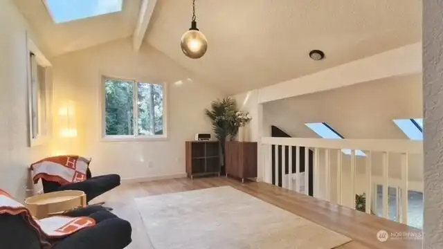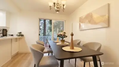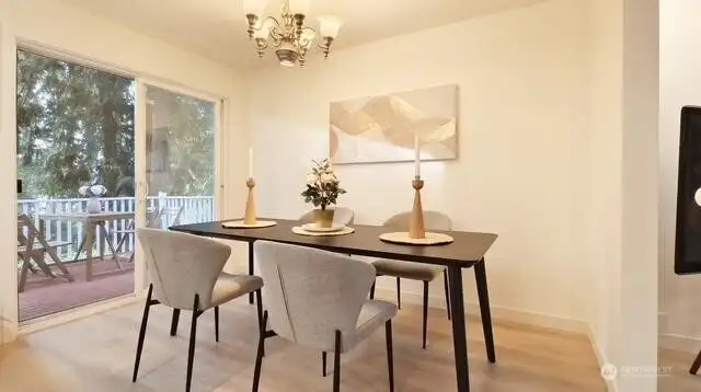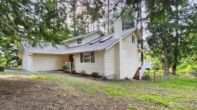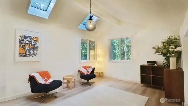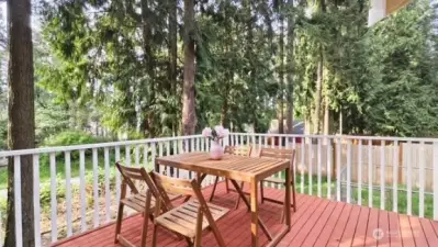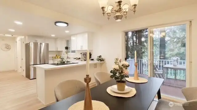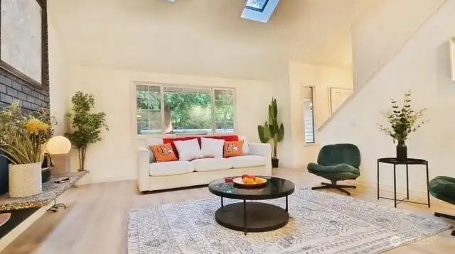 Welcome to your beautifully updated home on oversized lot in serene setting. Enjoy upgraded baths and kitchen with quartz countertops, stainless steel appliances and brand-new cupboards. Love sliding glass doors from dining room onto large deck to relax and entertain. Cozy around wood burning fireplace. High ceilings, new flooring, skylights and tons of windows for maximum sunlight. Excellent location. Don’t miss this one!