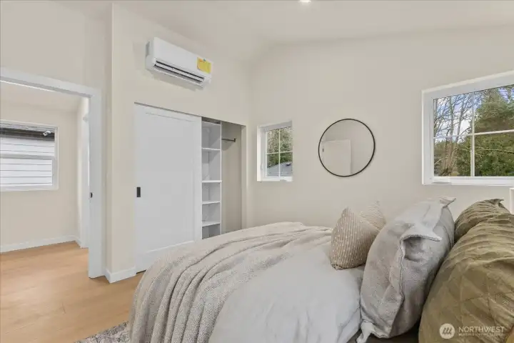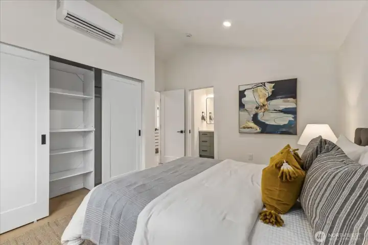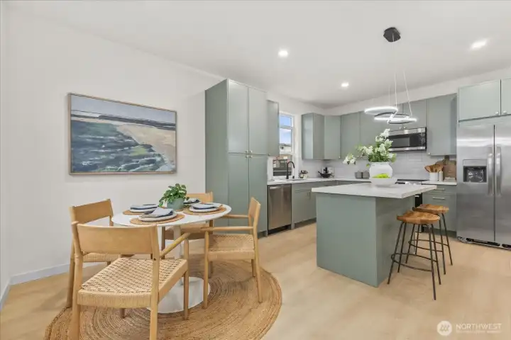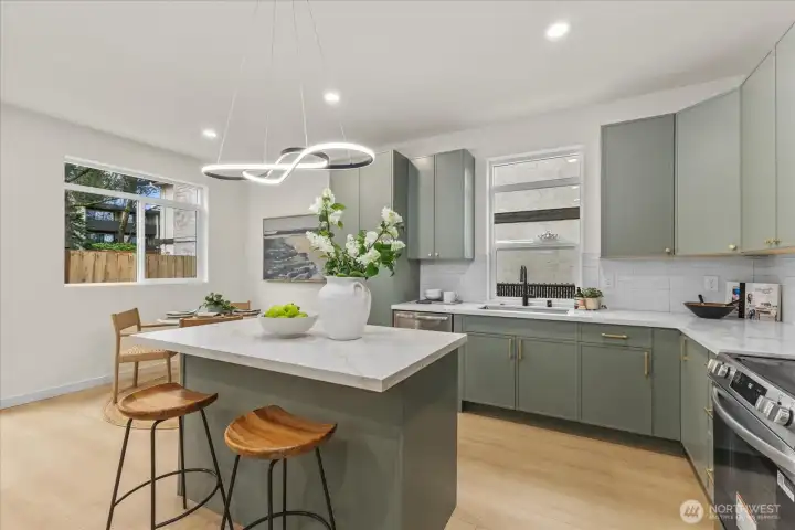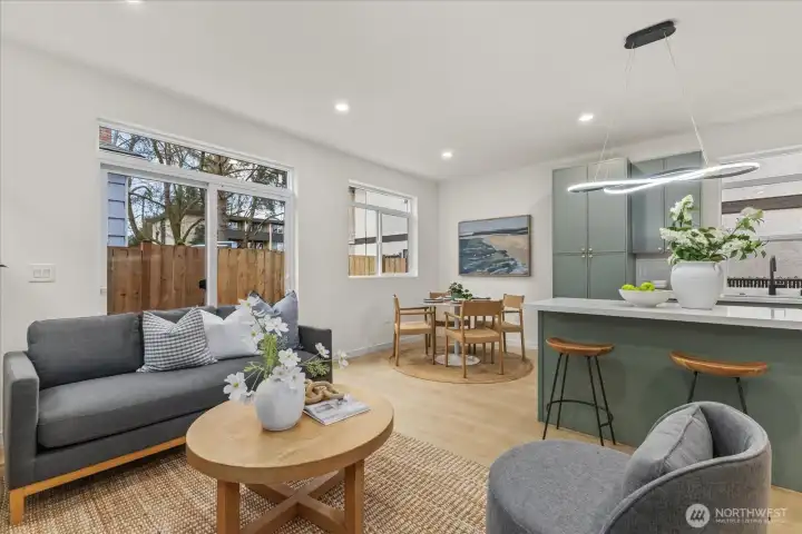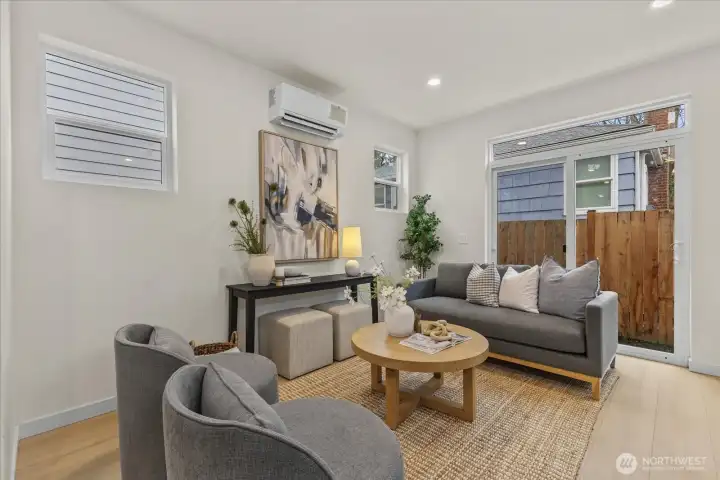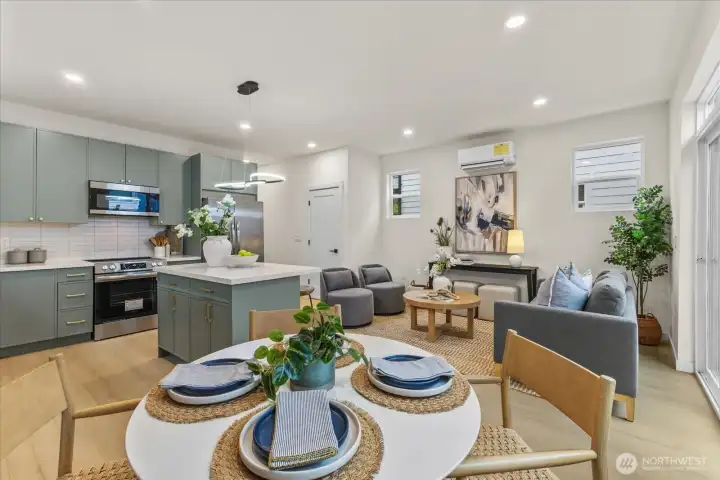 Tucked into a quiet setting in NE Seattle, this new construction home delivers a rare blend of modern design, smart layout, and effortless livability. Clean lines and a striking exterior welcome you inside to a light-filled interior where wide-plank flooring, oversized windows, and a soft contemporary palette create an airy, elevated feel. The open-concept main level is anchored by a sleek kitchen featuring stylish cabinets, quartz counters, and stainless appliances—flowing seamlessly into living and dining spaces designed for everyday comfort and easy entertaining. Entertain around the island with bar. Main level also offers a powder room for convenience. Upstairs, two spacious bedroom suites provide privacy and flexibility. Two beautifully finished baths showcasing modern tile work and refined fixtures. Thoughtful details like mini-split heating and cooling, efficient use of space, and abundant natural light enhance the home’s livability year-round. Outside, enjoy a low-maintenance setting with room to relax or host. This is modern Seattle living—stylish, efficient, and move-in ready.