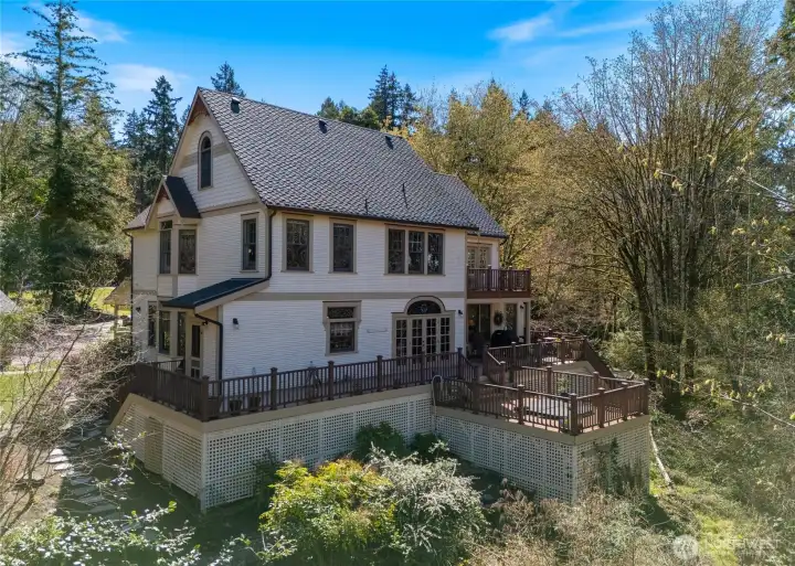 Stunning storybook custom-built Victorian estate in Gig Harbor is on the market for the very first time! Step into a timeless escape where quality craftsmanship, character, & quiet luxury come together perfectly. Nestled on 3.61 acres across two parcels, this home feels like a private retreat with its peaceful seclusion surrounded by natural beauty. Inside, over 5000 sq. ft. unfolds with intention & grace, from the elegant parlor & formal dining room to the warm, welcoming kitchen crowned with a classic tin ceiling. Oak hardwood floors run underfoot, while leaded & stained glass windows cast soft, colorful light throughout. Rich, solid wood millwork & custom cabinetry speak to the level of craftsmanship honored here. This home offers 4 bedrooms, 3 baths, a dedicated office, & an expansive lower-level perfect for gathering, entertaining, or simply spreading out. An unfinished attic provides abundant storage & future potential. Outside, the home's architectural presence is unforgettable. A striking 3-story turret, imbricated shingles, ornamental frieze, & intricate gingerbread trim create a true Victorian masterpiece. The covered wrap-around porch invites morning coffee or evening reflection, while the grounds are designed for both beauty & enjoyment, featuring an in-ground pool, hot tub, circular driveway, & territorial views. With a location across the street from schools & next to Kopachuck State Park, this home offers a rare blend of seclusion and convenience.